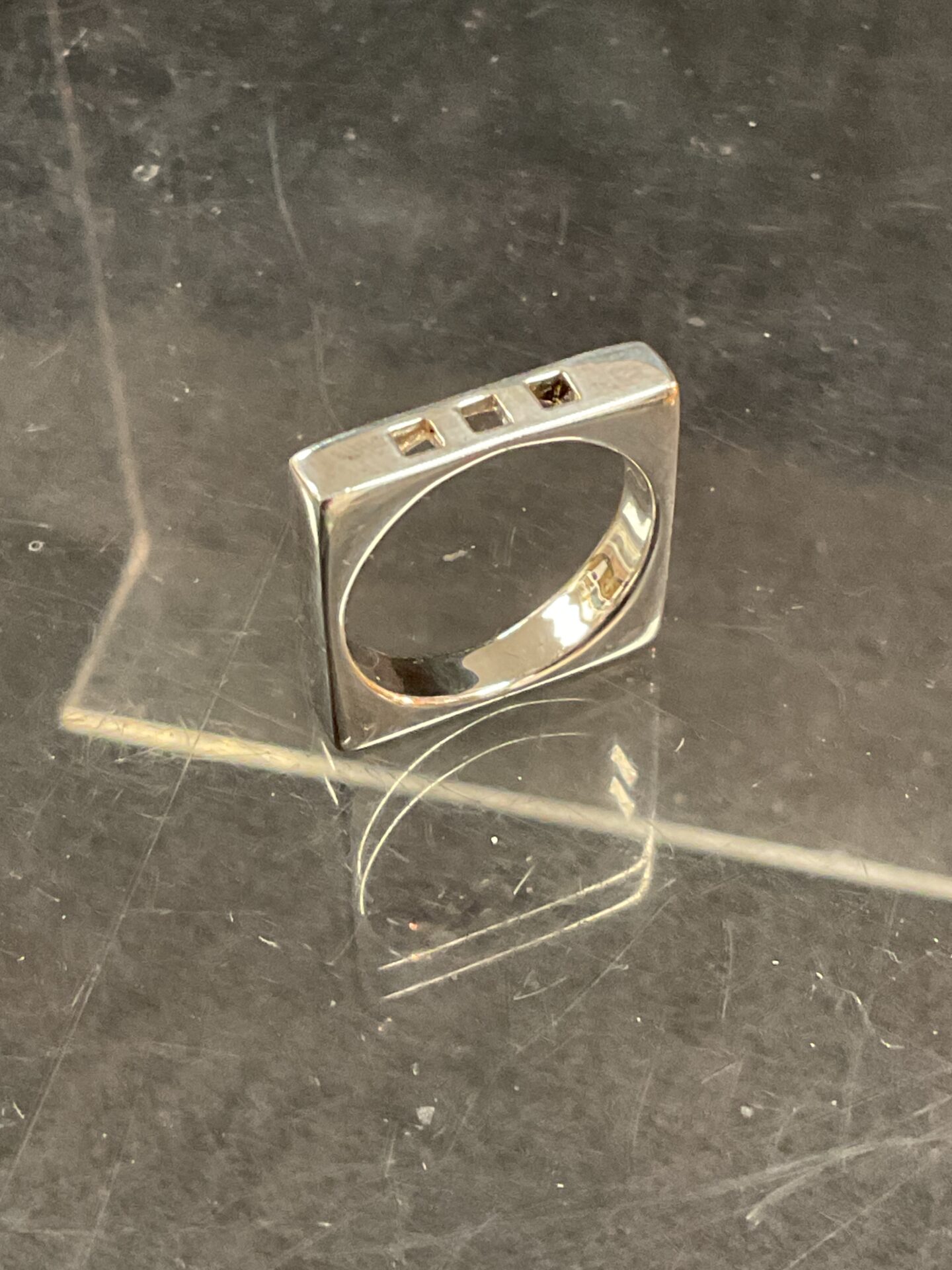 This silver ring is presented for consideration. It may show signs of wear consistent with age and use. This ring would appeal to collectors of silver jewellery or those seeking a unique and modern addition to their collection.
