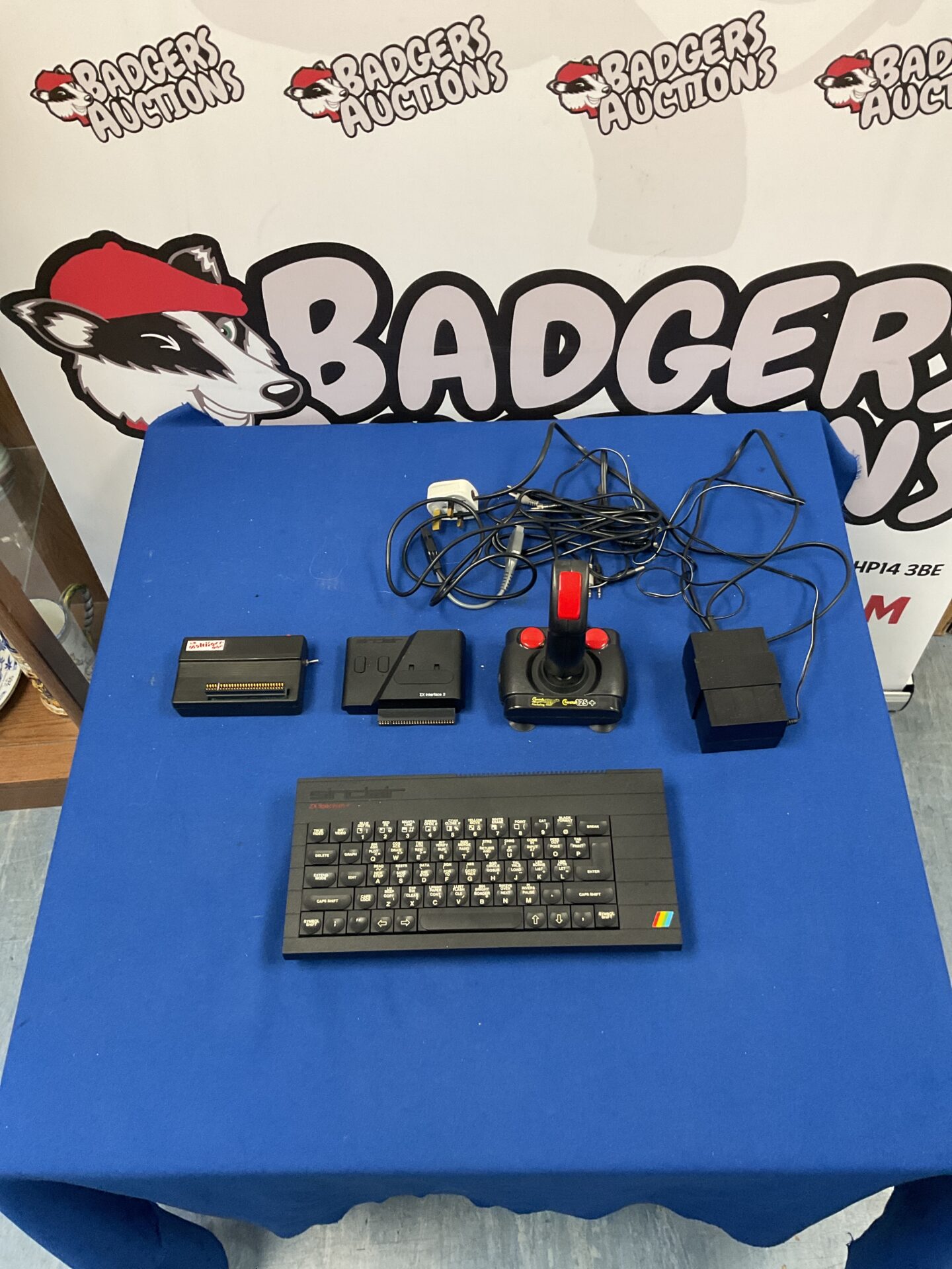 This lot features a Sinclair ZX Spectrum + computer, a popular 8-bit home computer released in the 1980s. The Spectrum + is known for its distinctive rubber keyboard and its role in introducing many people to the world of home computing and gaming. Included is a Cheetah 125+ joystick, a common peripheral used for playing games on the Spectrum.