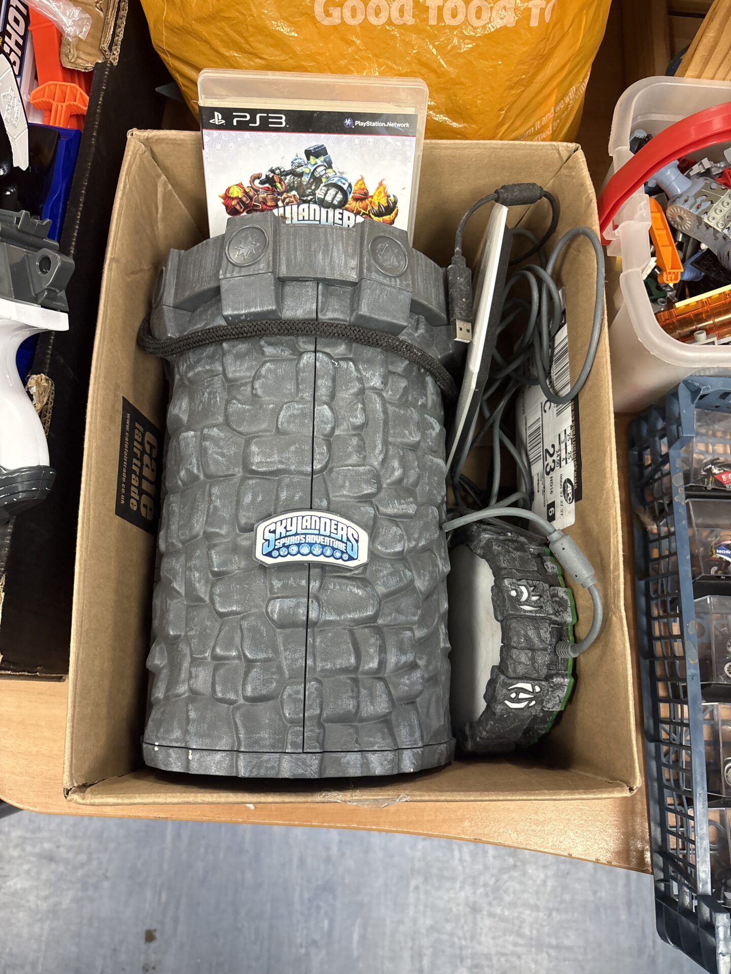 This lot features a Skylanders Adventure Tower, designed to enhance the gaming experience for Skylanders players. The tower is a central component for interacting with Skylanders figures within the game, allowing players to progress and unlock new content. Included is a PS3 Skylanders game and a portal to connect the figures.