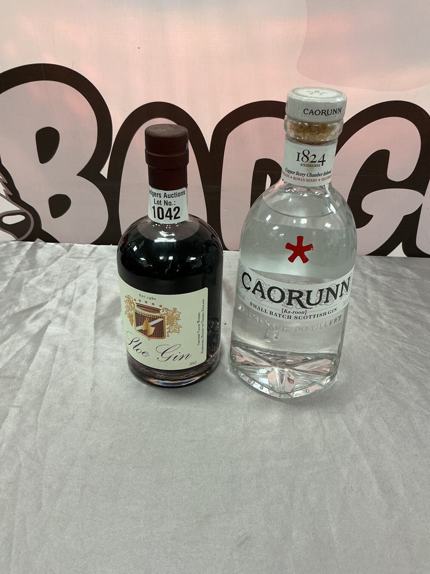 This lot presents a pairing of two distinct gins: a rich, ruby-red Sloe Gin and a bottle of Caorunn Scottish Gin. The Caorunn gin, distilled in Speyside, is known for its complex botanical profile, incorporating herbs and spices alongside traditional juniper. The Sloe Gin offers a contrasting flavour, created by infusing gin with sloes – the fruit of the blackthorn bush – resulting in a sweet and tart spirit.