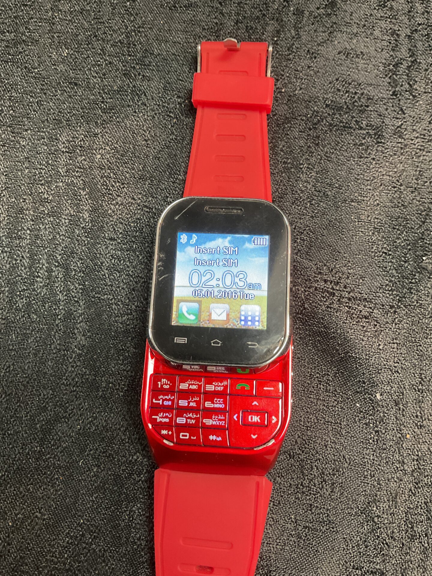 This Ken Xin Da smart watch phone combines the functionality of a mobile phone and a wristwatch. Featuring a colour touchscreen and a sporty red silicone strap, this wearable device offers a unique glimpse into early smart watch technology. A potentially interesting item for collectors or enthusiasts of retro tech.