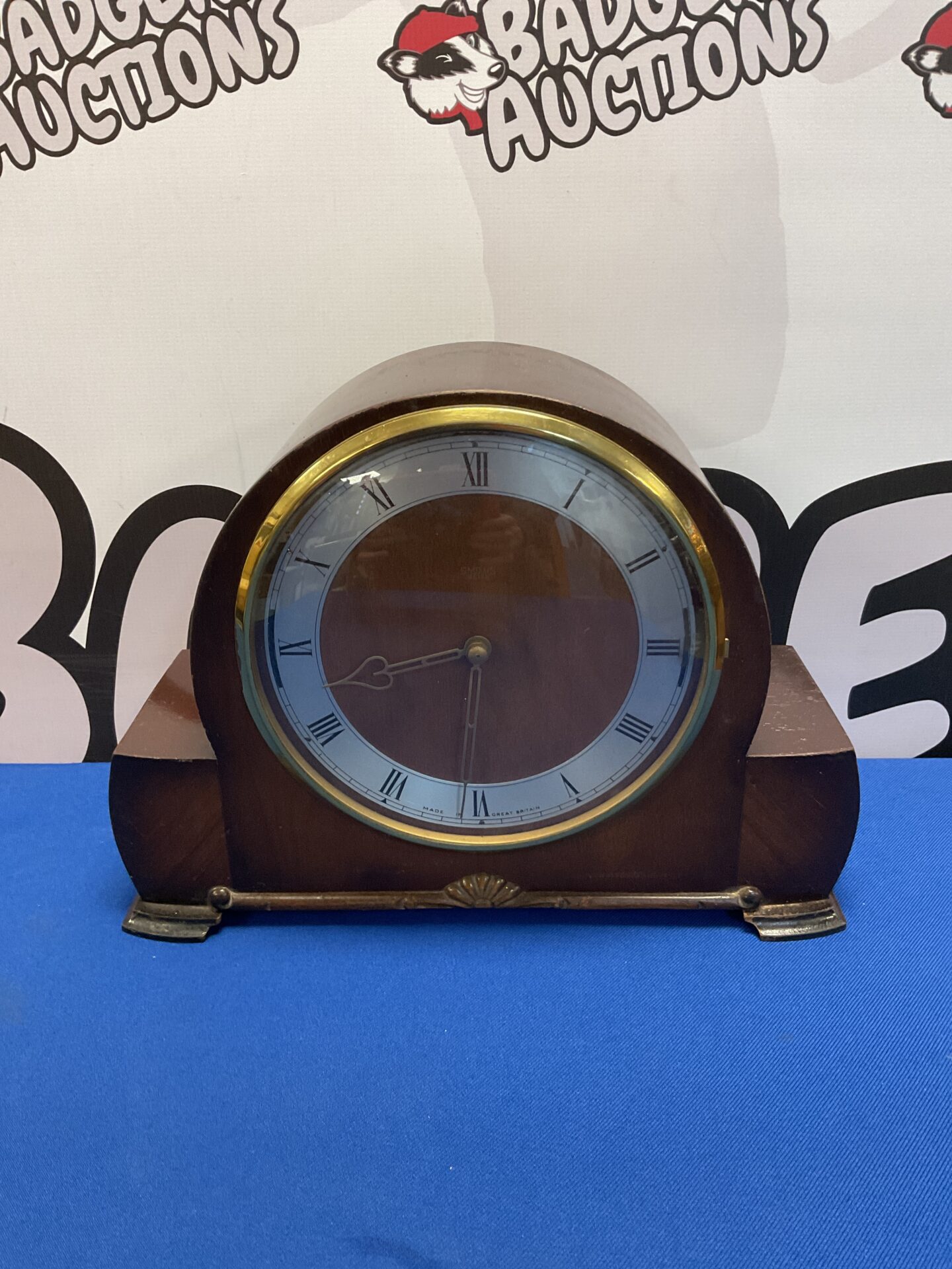 This is a Smiths electric mantle clock, likely dating from the 1930s or 1940s. The clock features a classic art deco style case, with a stepped design and a polished wood finish. The dial is silvered with black numerals and hands, and the movement is electric, designed to be powered from the mains.