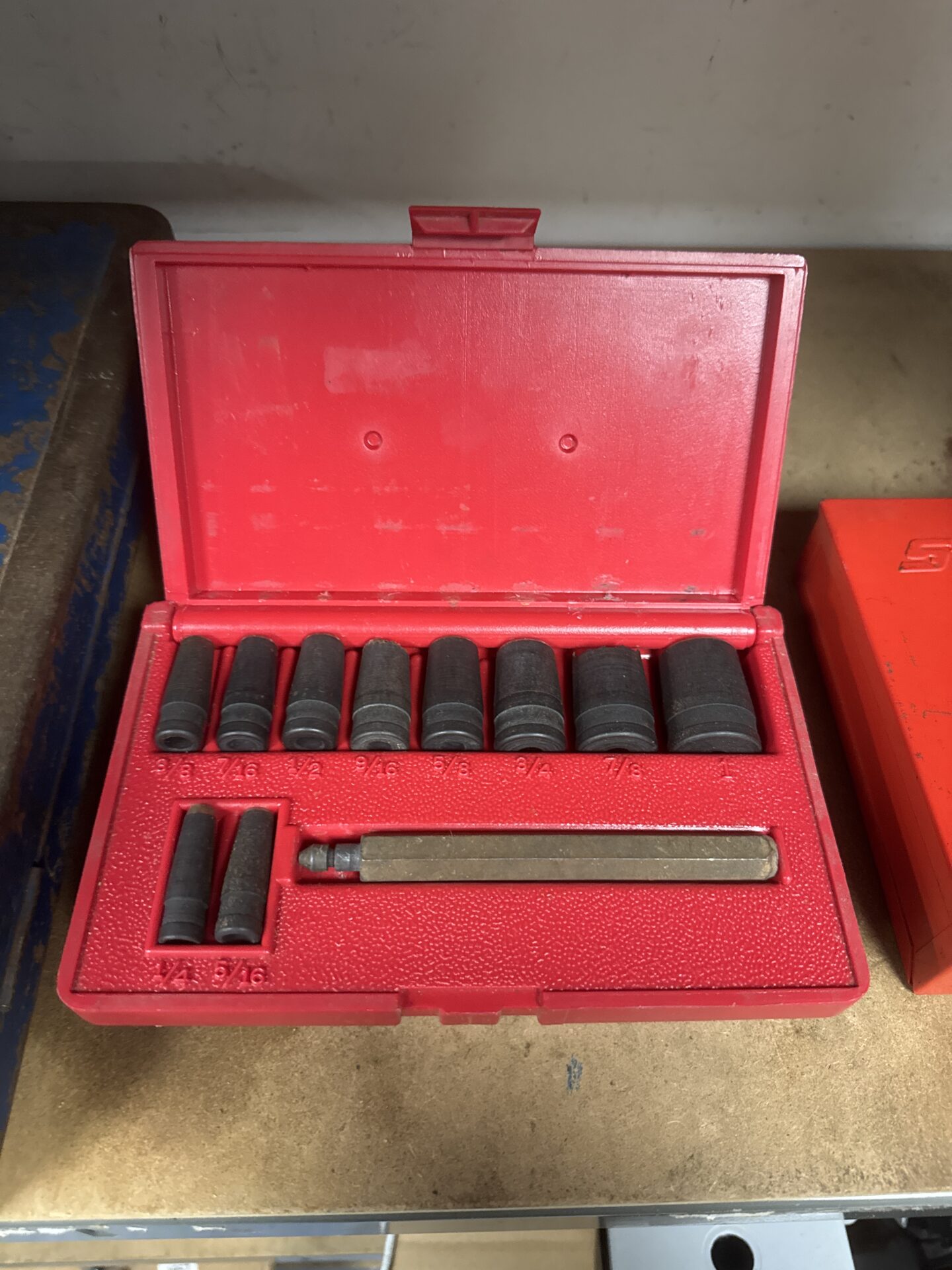 This is a Snap On 11-piece gasket punch set, designed for removing gaskets during engine repair and maintenance. The set includes a variety of punch sizes to accommodate different gasket thicknesses and applications. Constructed from hardened steel, these punches are built for durability and precision, offering a reliable solution for professional mechanics and automotive enthusiasts.