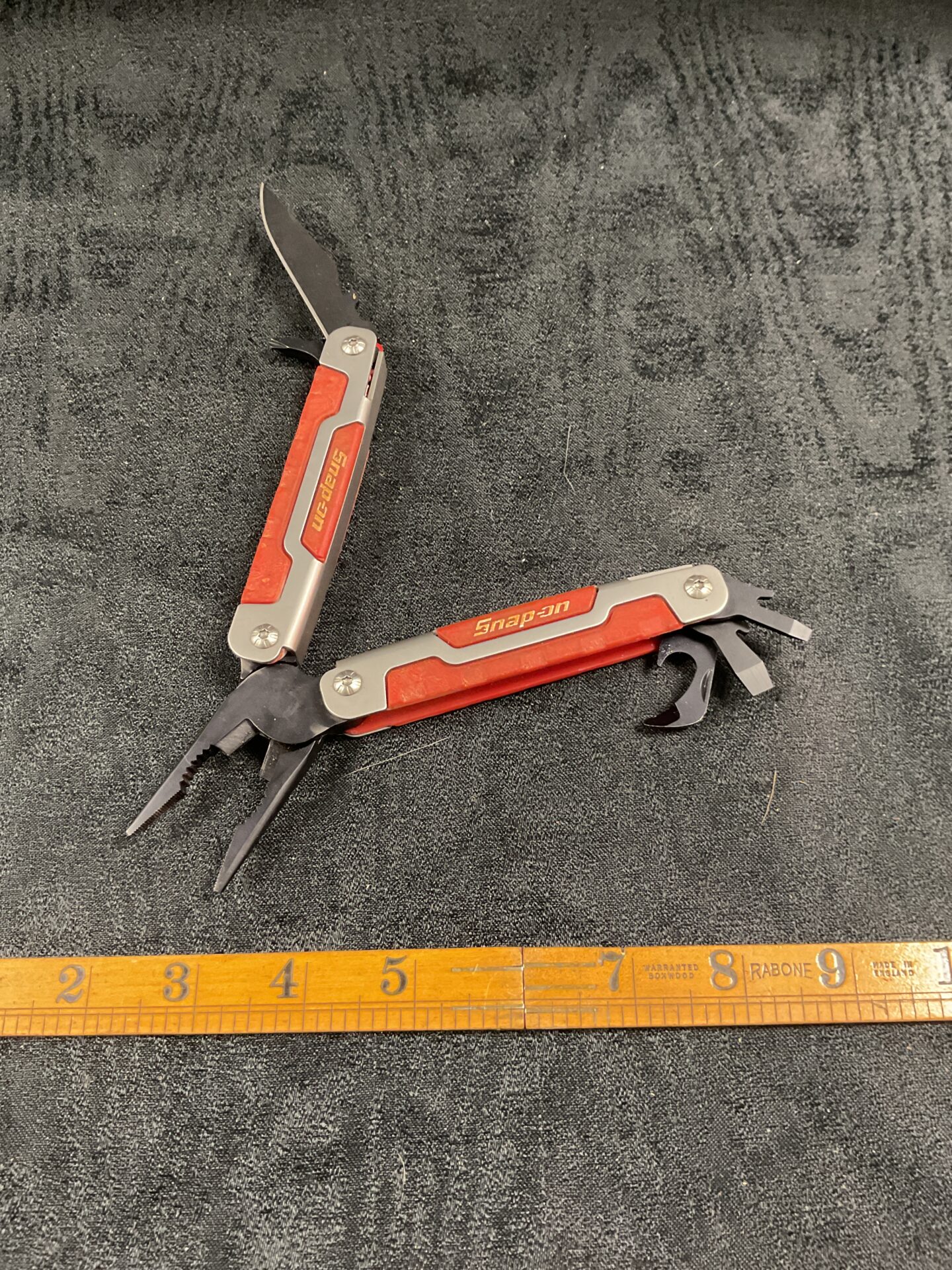 This is a Snap On multitool, a versatile hand tool designed for a variety of tasks. Featuring a robust construction and a compact design, this tool incorporates pliers, a knife blade, and other useful implements. The red and black colour scheme is typical of Snap On’s professional-grade tools, known for their durability and quality.