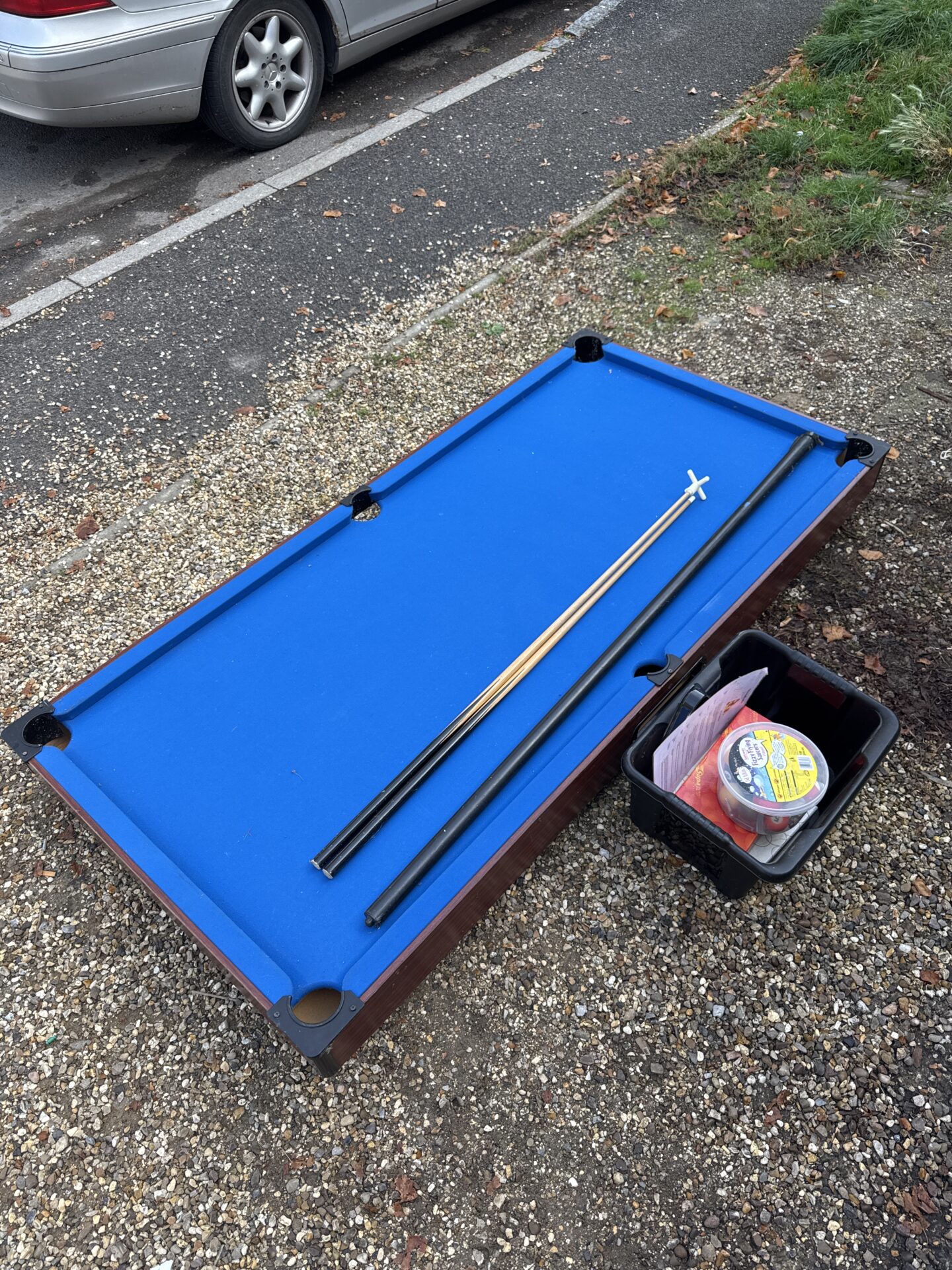 1143 Snooker Table 72” Length (legs Present Taped Underneath) With Cues, Balls & Chalk Etc