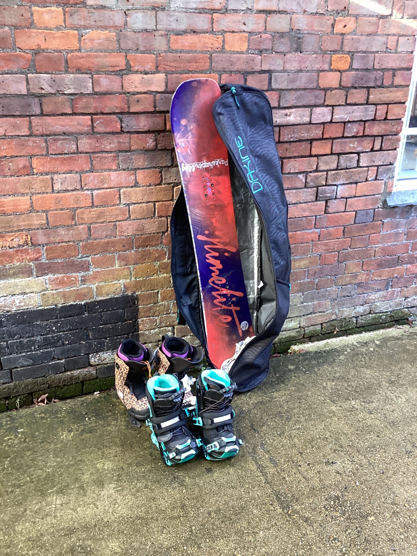 This lot comprises a snowboard, a snowboard bag, bindings, and two pairs of snow boots, both size 6. The snowboard is encased within a durable carrying bag, suggesting it has been stored and transported. The inclusion of bindings indicates a complete setup ready for the slopes, while the two pairs of boots offer flexibility or spares for extended use.