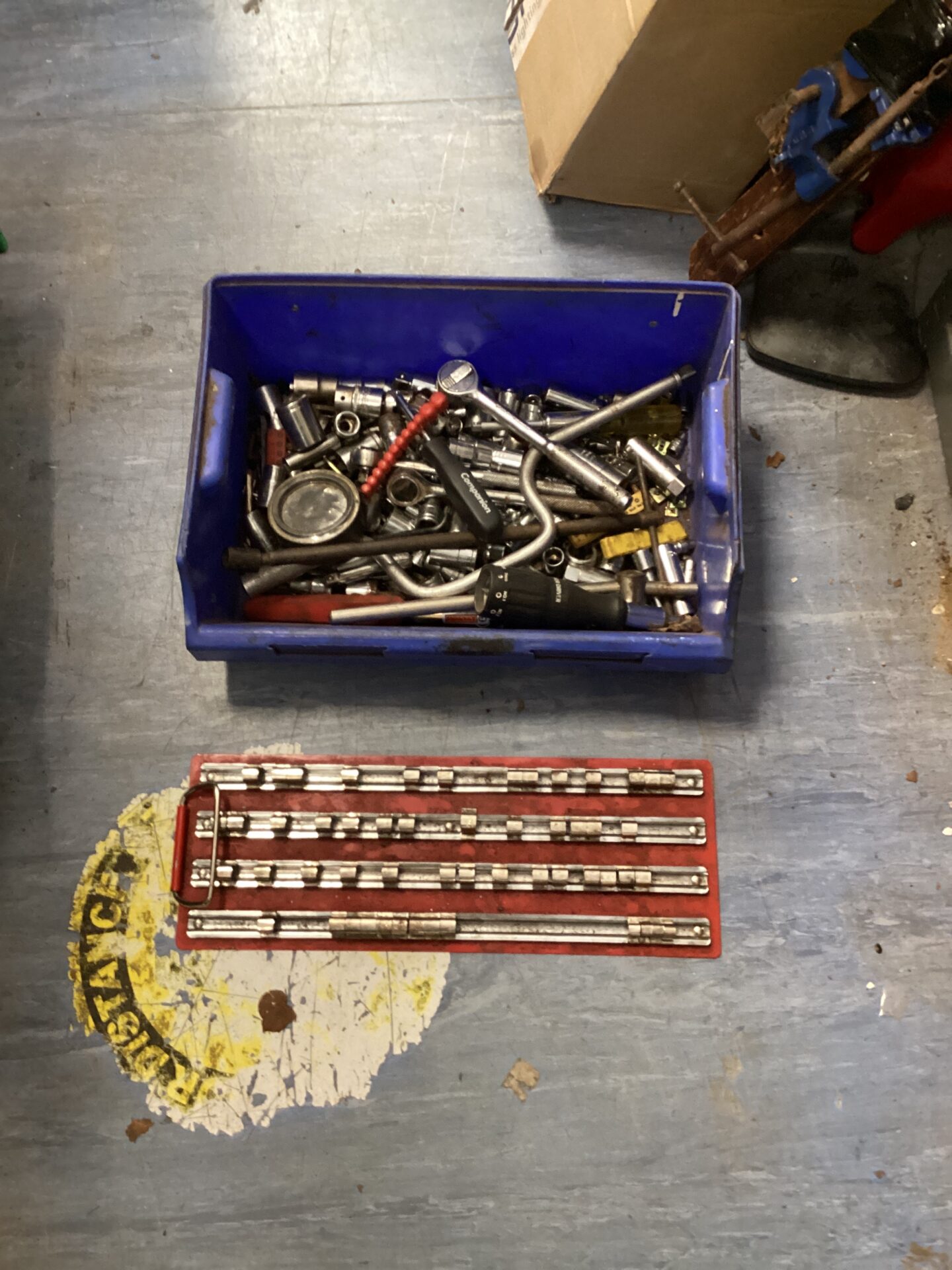 This lot comprises a collection of sockets and tools, seemingly geared towards automotive or mechanical work. The assortment includes various sizes of sockets, potentially with a 1/2” drive, and a hanging rack designed to organise them. The tools appear to be a mix of standard and potentially deep sockets, along with other workshop implements.