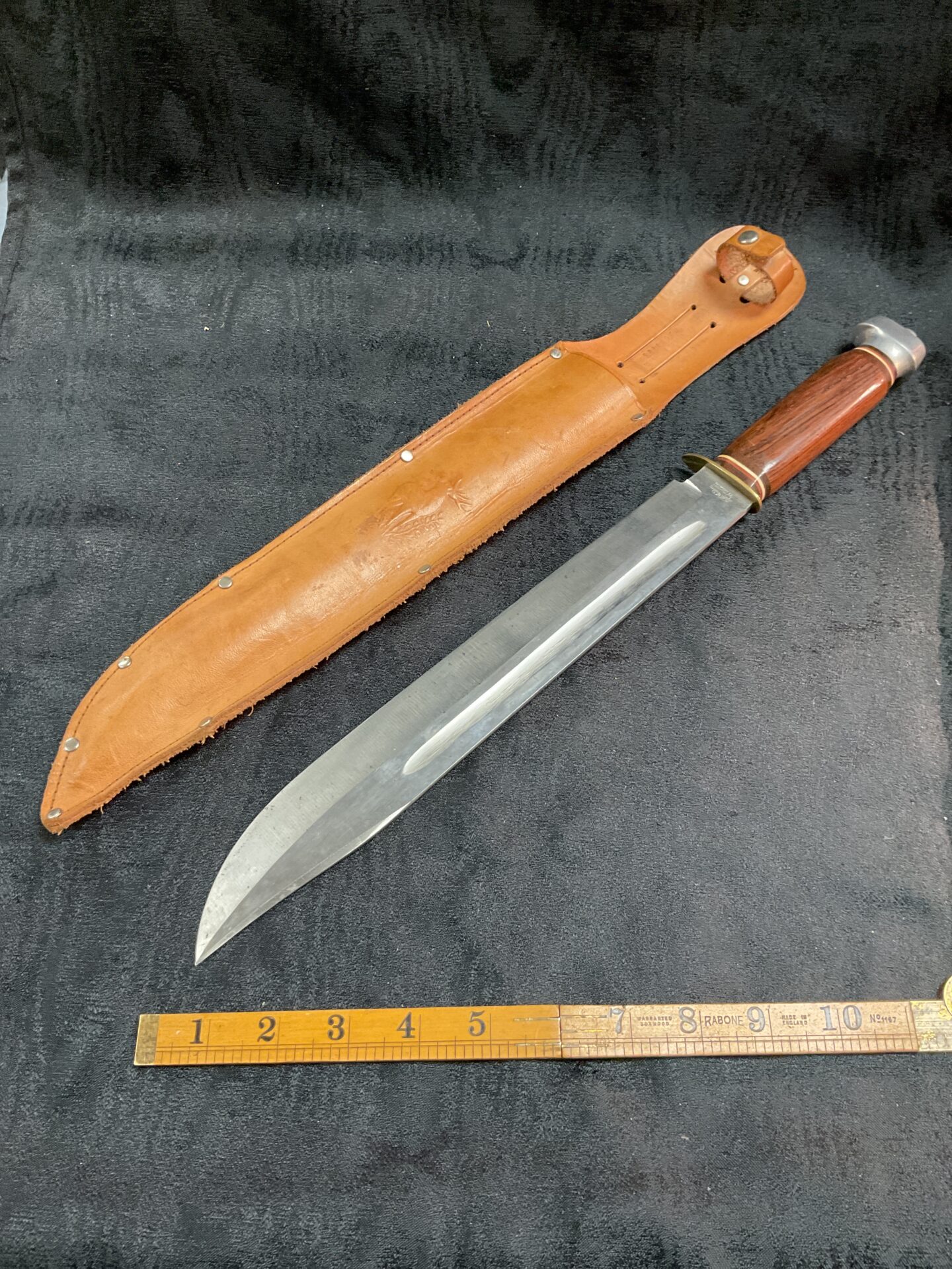 This vintage Bowie knife hails from the famed Solingen steelworks in Germany. Featuring a robust fixed blade and a dark wood handle, it comes complete with a leather sheath. A classic piece for collectors or enthusiasts of historical weaponry.
