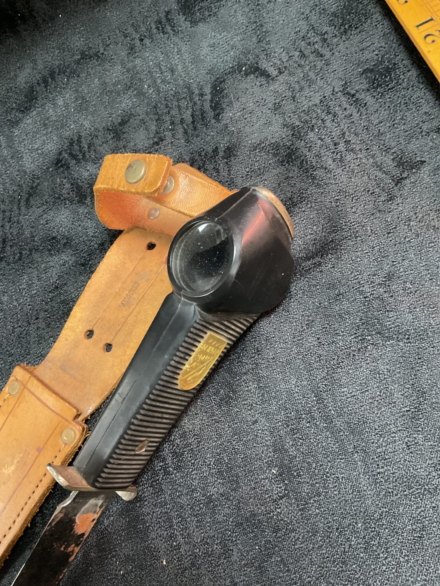This is a vintage hunting knife manufactured in Solingen, Germany, and featuring a unique integrated telescope within the handle. The knife boasts a steel blade and a black composition handle, likely Bakelite or similar material, with a distinctive gold-coloured emblem. The DBGM (Deutsches Gebrauchsmuster) mark indicates a registered design, suggesting a level of innovation and quality in its construction. This knife is a fascinating example of early 20th-century craftsmanship and ingenuity.