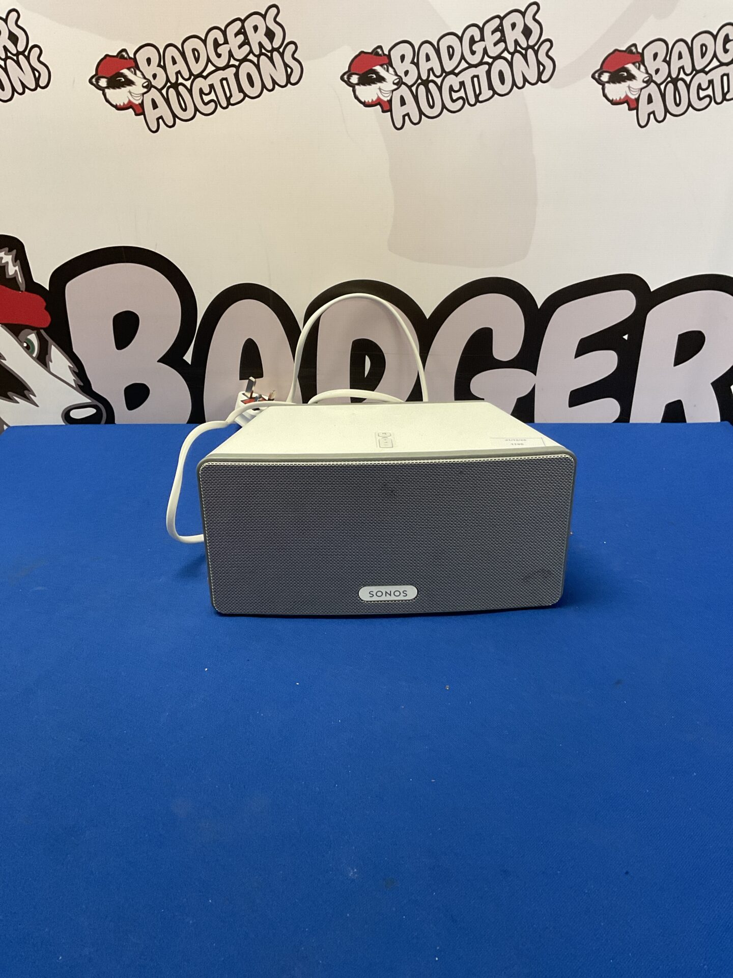 This Sonos Play 3 shows signs of previous use and may exhibit cosmetic wear consistent with age. It is offered in its original form, and its functionality is not assessed. This speaker may appeal to Sonos enthusiasts, collectors of vintage audio equipment, or those seeking to expand an existing Sonos system.