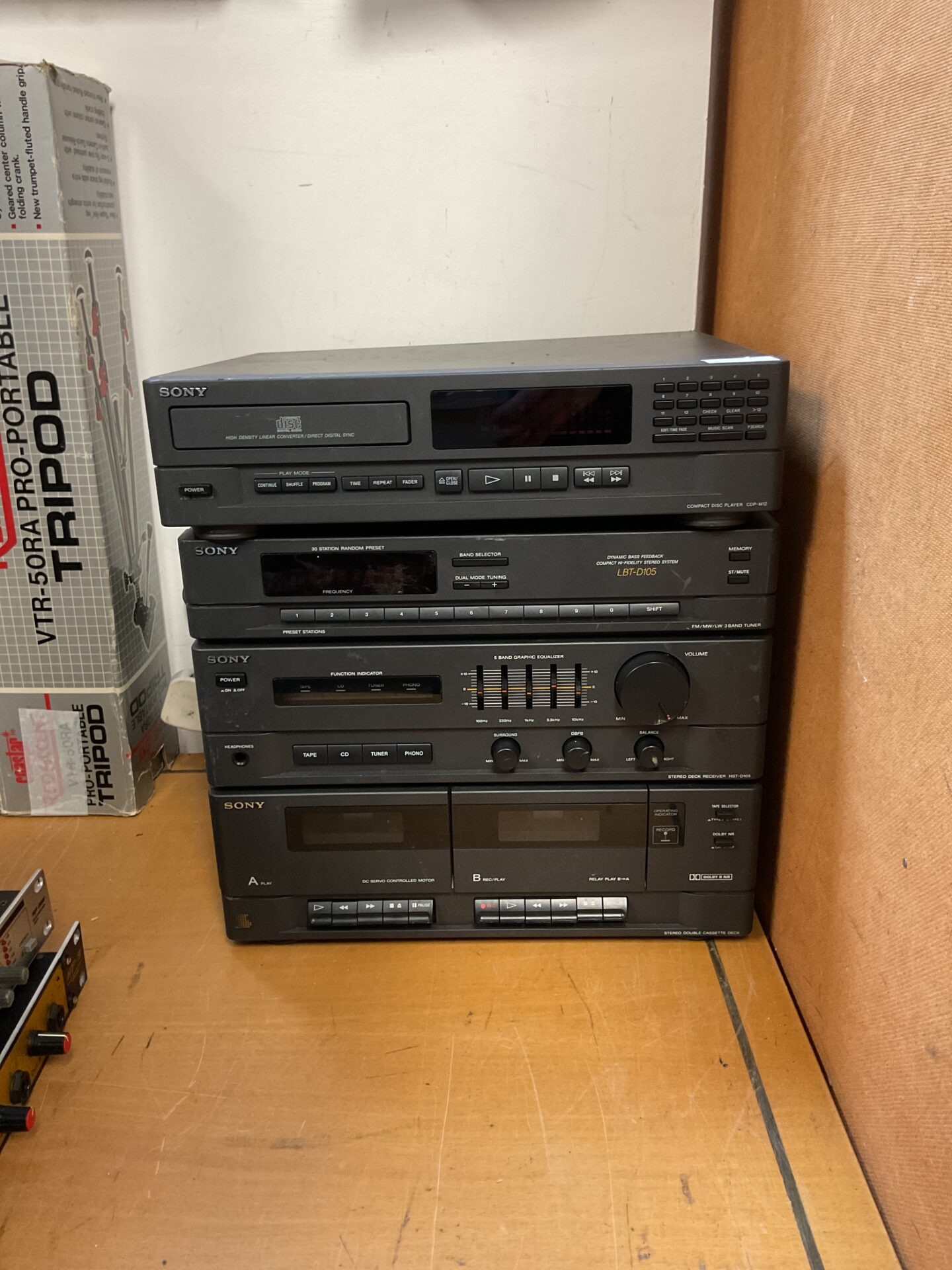 This is a Sony Hi-Fi system, comprising the CDP-M12 CD player, LBT-D105 stereo system, HST-D105 stereo receiver, and a stereo double cassette deck. The system showcases a classic late 20th-century aesthetic, typical of Sony’s audio equipment from that era. It features a modular design, allowing for flexible configuration and expansion. The components are designed to deliver high-fidelity sound reproduction, catering to audiophiles and music enthusiasts.