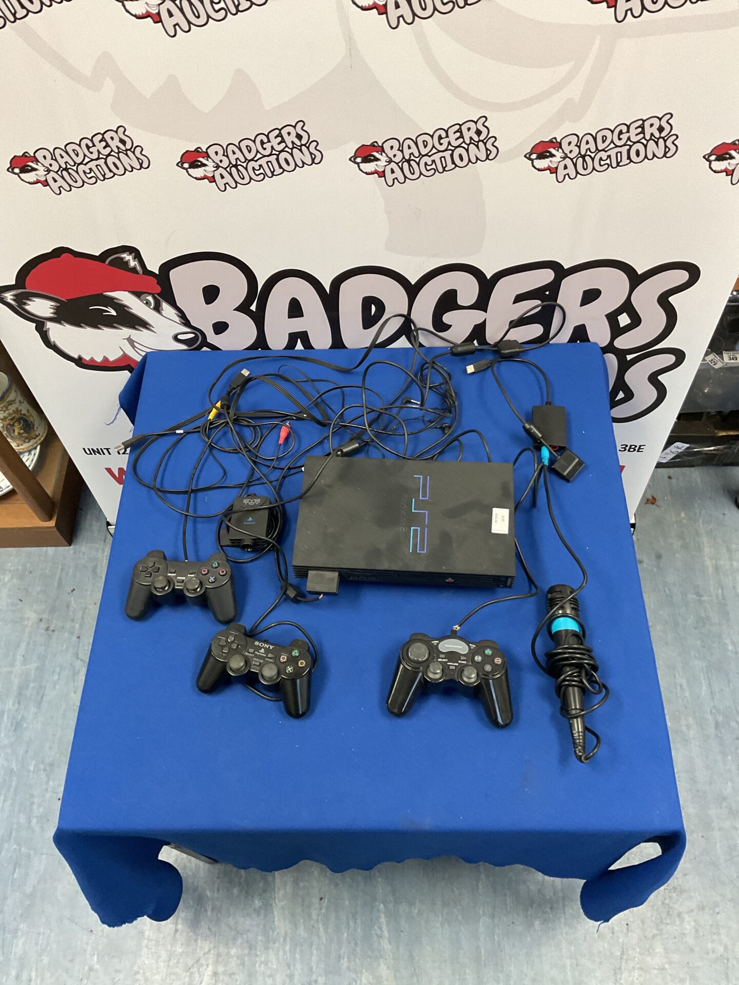 This is a Sony Playstation 2 (PS2) gaming console, a hugely popular system from the early 2000s. This lot includes the console itself, two controllers, and a Singstar microphone, making it ready for both single-player adventures and multiplayer fun. The PS2 was known for its extensive game library and DVD playback capabilities, offering a versatile entertainment experience.