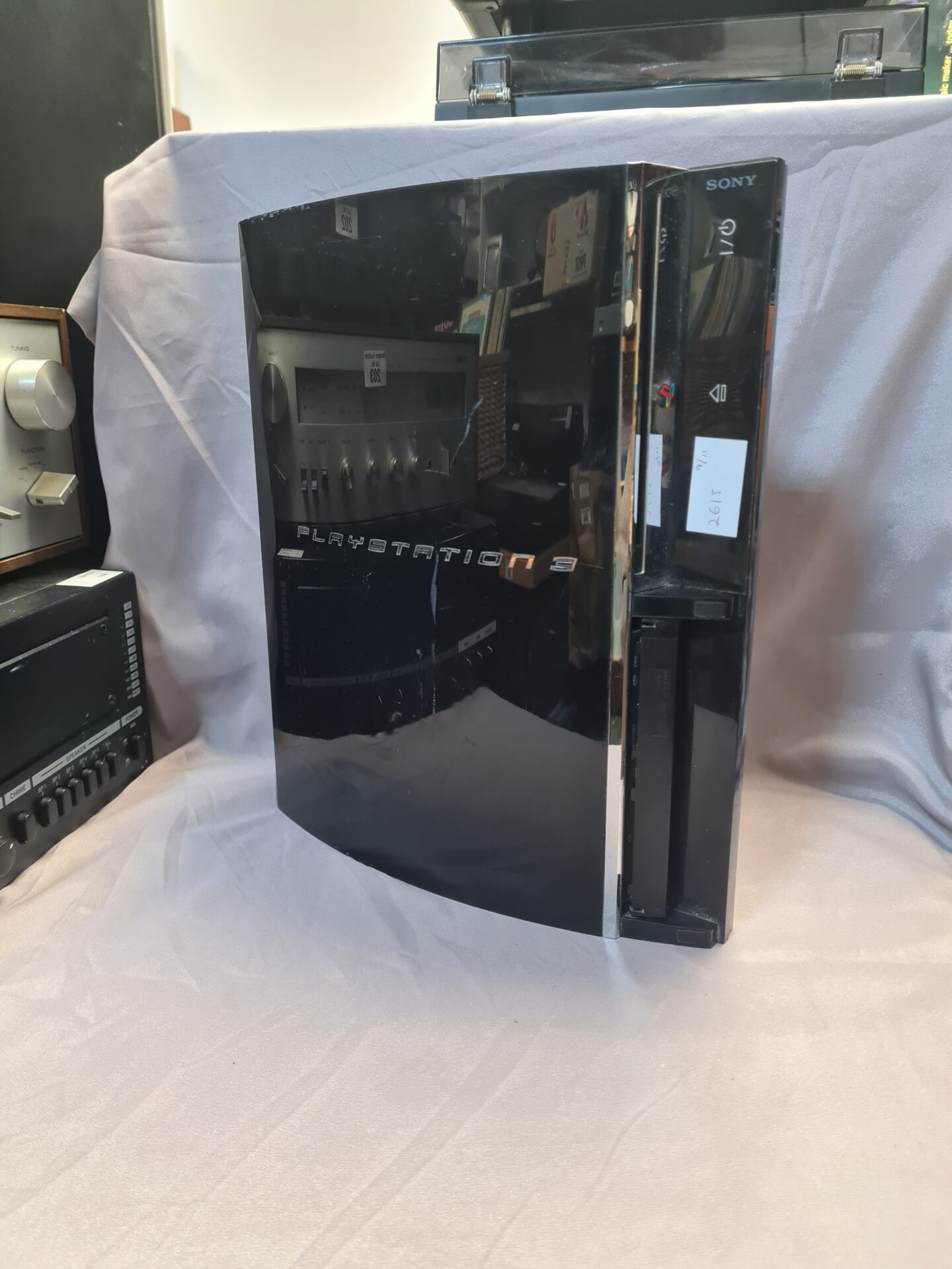 This is a Sony Playstation 3 gaming console. This model is known for its backwards compatibility, allowing it to play games from previous Playstation generations. The console features a sleek black design and was a popular choice for gamers during its release.