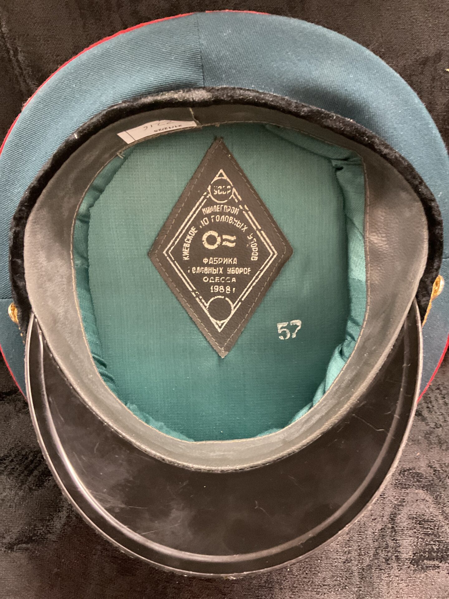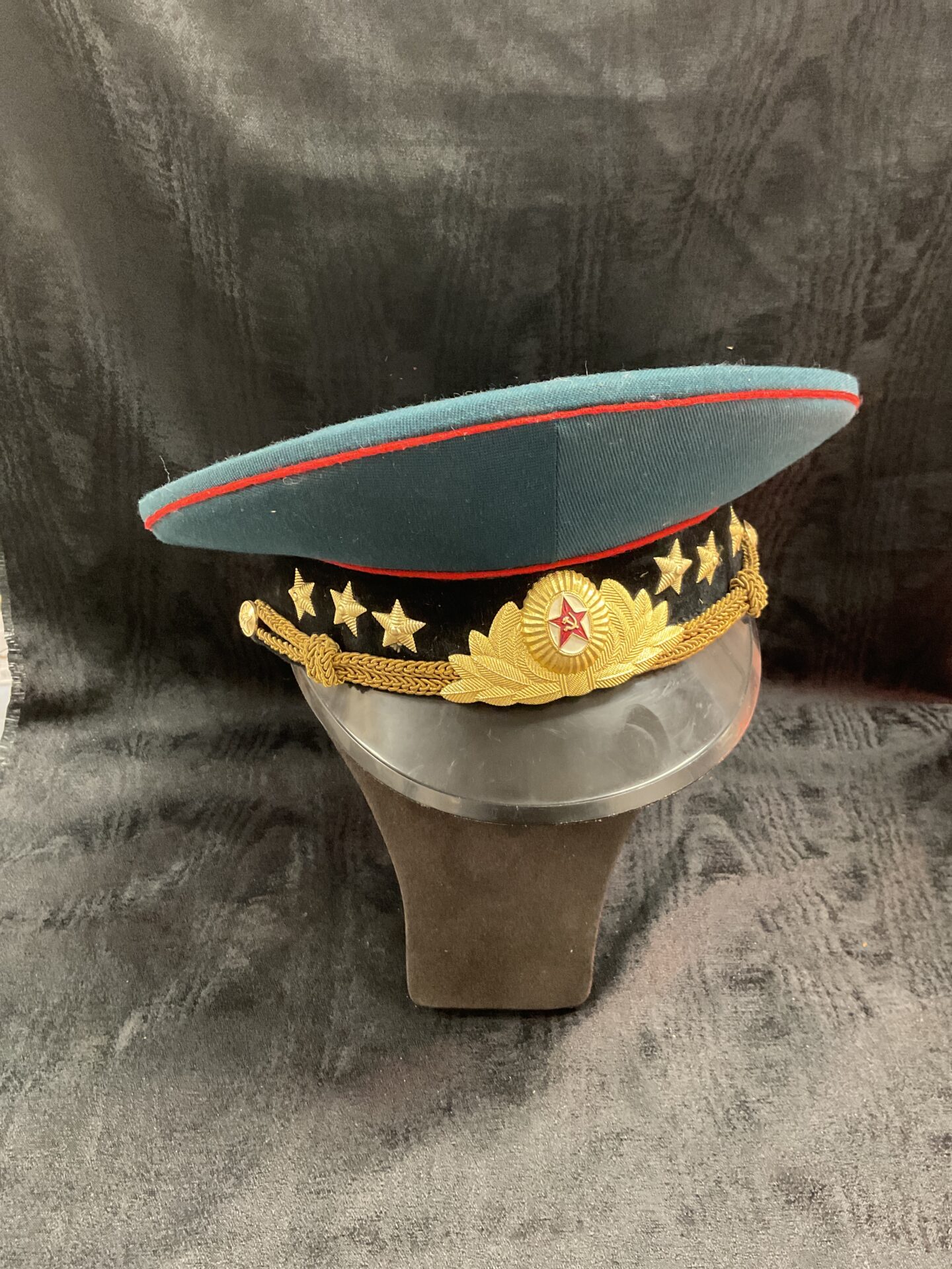 This is a vintage Soviet military officer’s visor cap, likely dating to the mid-to-late 20th century. The cap features a rigid peak, a teal blue wool crown, and a red band. Embellishments include a star-shaped insignia with a central emblem, and gold-coloured stars affixed to the band. The cap’s construction suggests a high-ranking officer’s uniform, with attention to detail in the braiding and insignia placement.