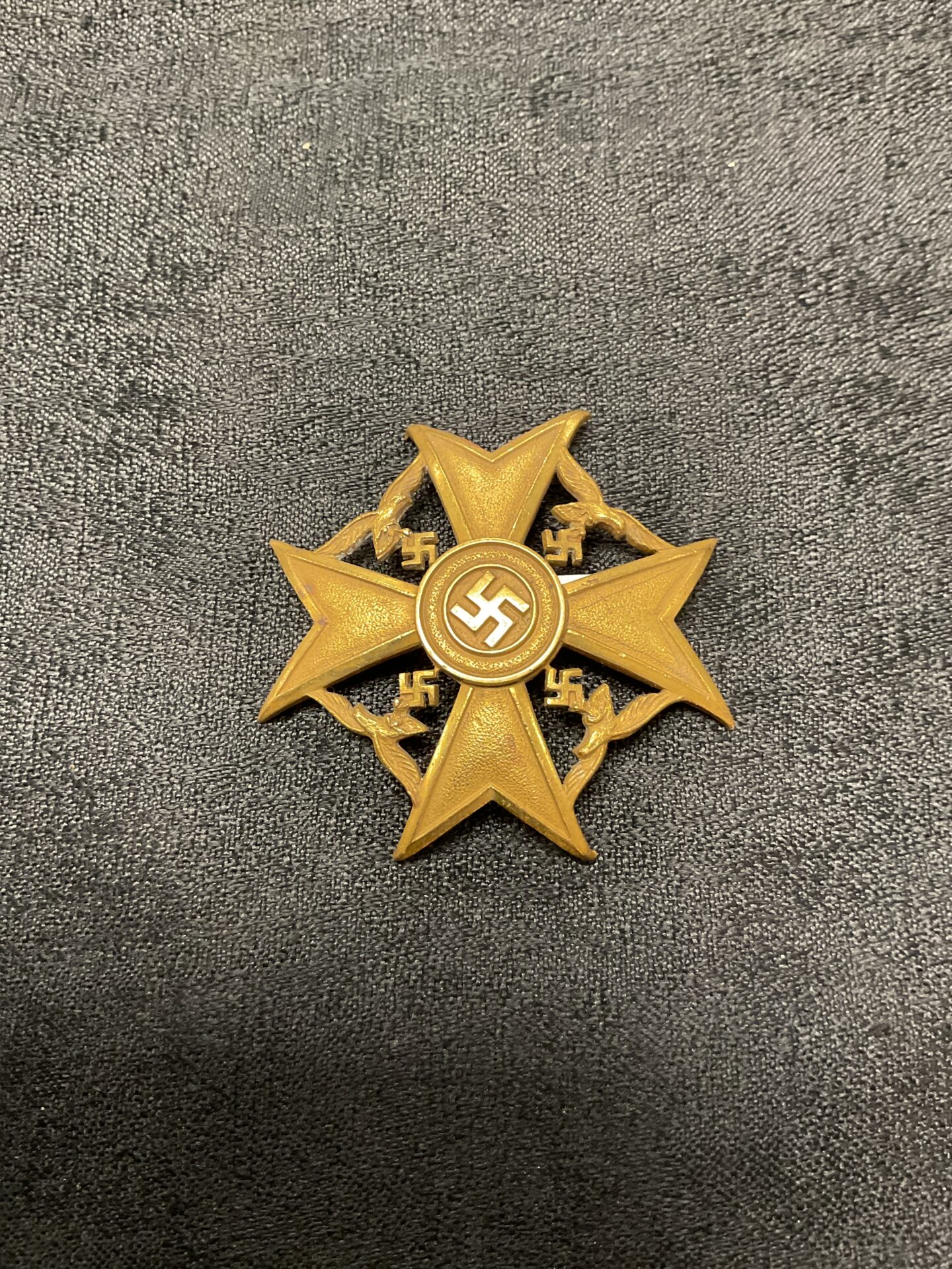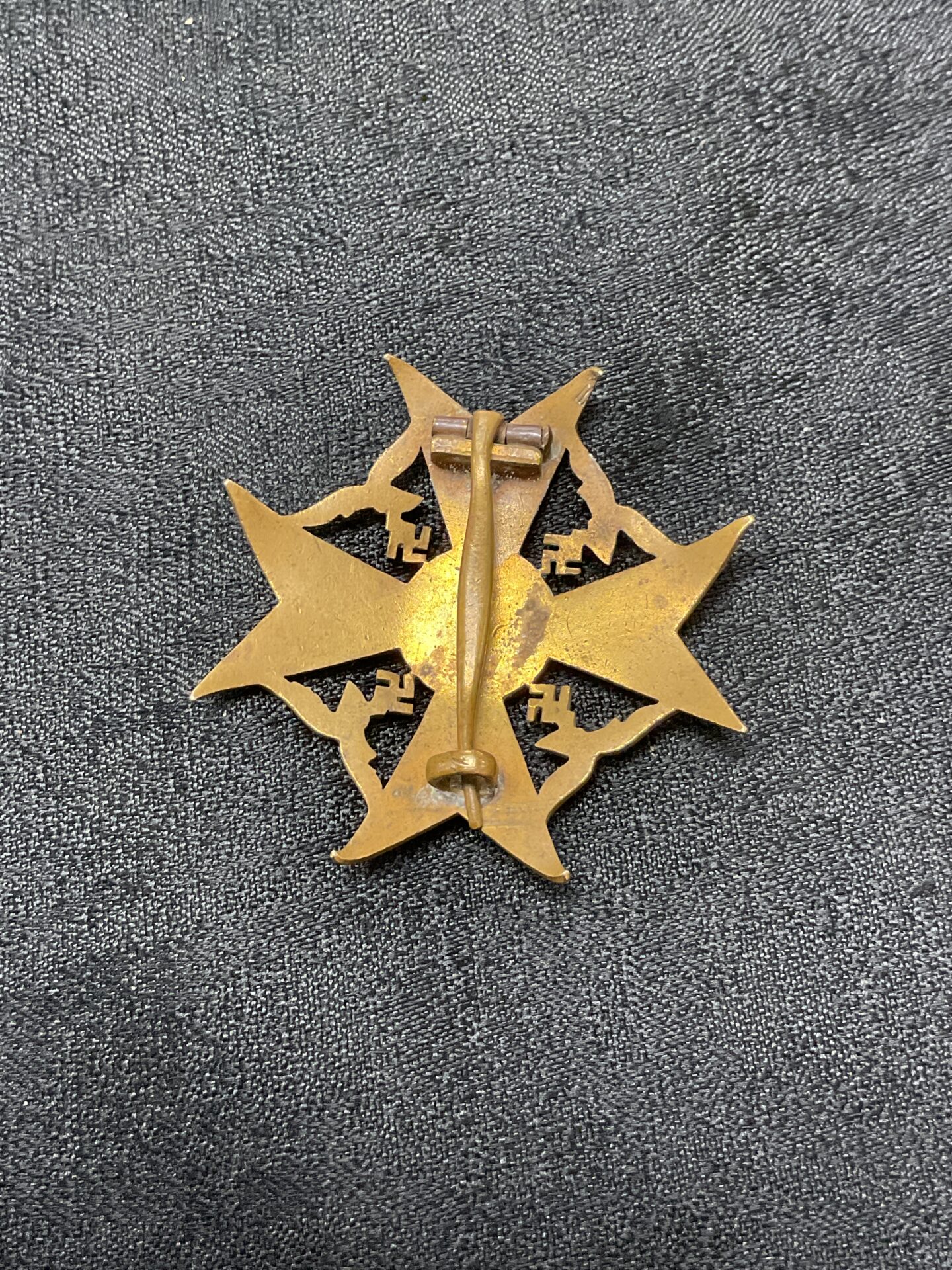 This Spanish Bronze Cross was awarded by Nazi Germany to foreign volunteers fighting with the Nationalist forces during the Spanish Civil War. Featuring a central swastika and eight-pointed star design, this medal is a historical artifact from a turbulent period. A desirable collectible for those interested in WWII and Spanish Civil War history.