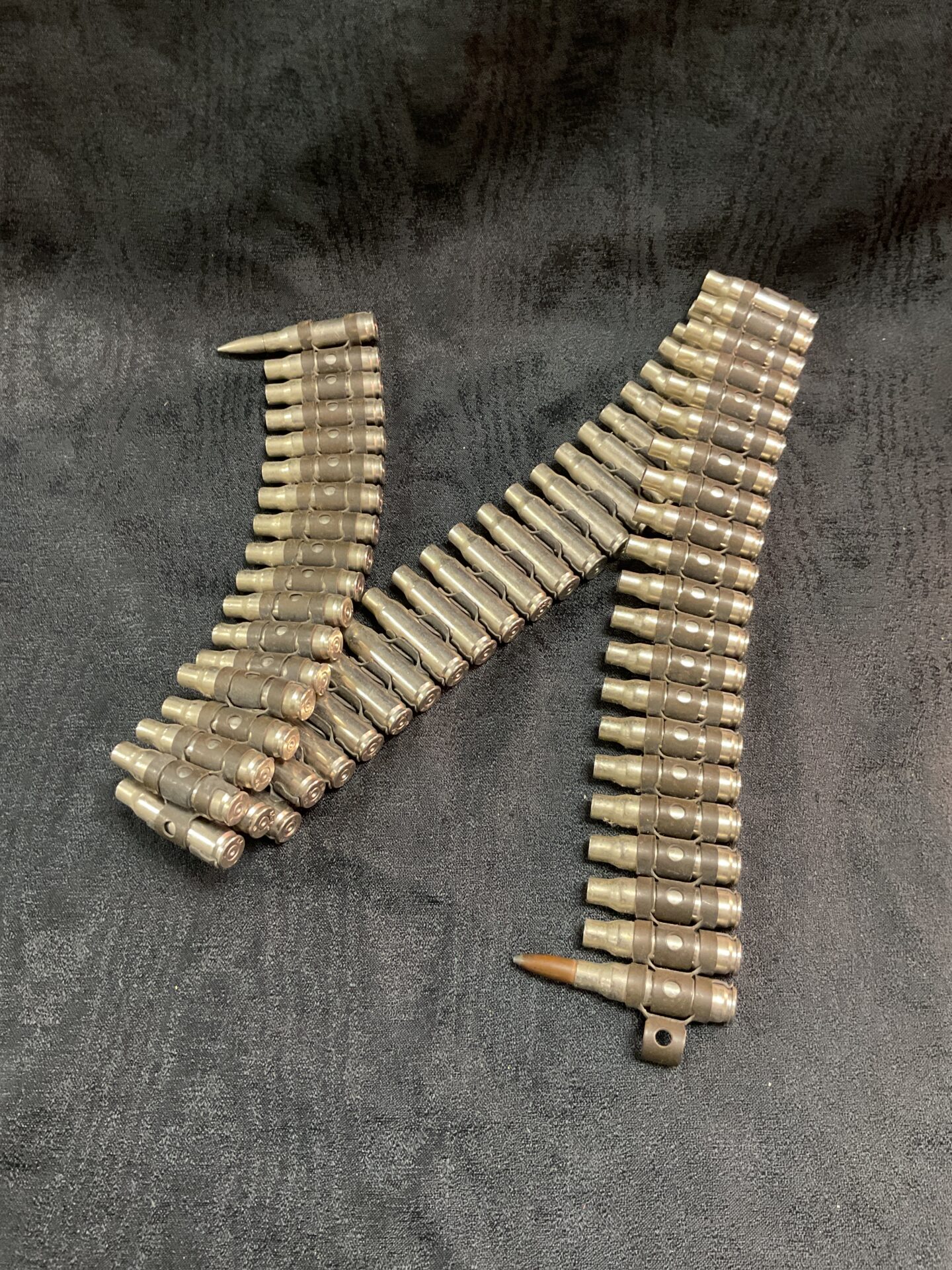 The belt is in used condition, with casings exhibiting wear and discoloration consistent with being fired. While not functional ammunition, it serves as a unique collectible item, potentially appealing to those interested in deactivated military equipment or shooting range relics. The belt’s history and the story it tells make it a fascinating piece for display or inclusion in a collection.