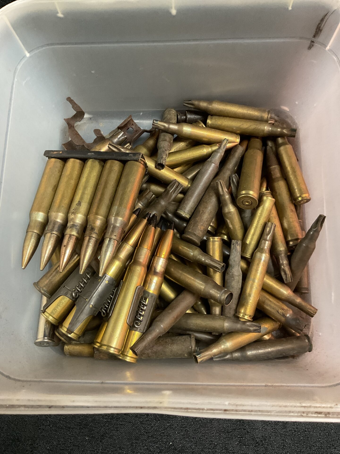 This lot consists of a collection of spent bullet cartridges. The cartridges appear to be a mix of various calibres and manufacturers, exhibiting a range of headstamp markings. These cartridges have clearly been fired, as evidenced by the spent primer and deformed case mouths.