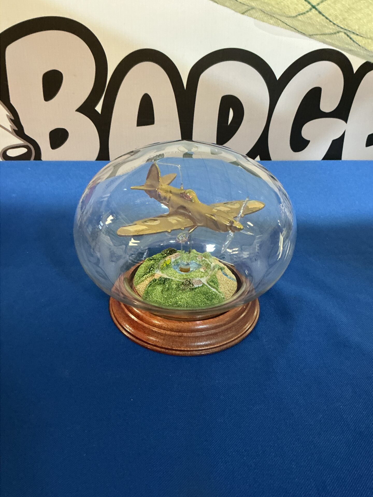 This Spitfire model appears to be in excellent condition, with no visible damage to the model or the glass dome. It’s a perfect piece for aviation enthusiasts, history buffs, or collectors of vintage aircraft memorabilia. The combination of the detailed model, protective glass dome, and classic base makes this a standout display item that will be a conversation starter for years to come.