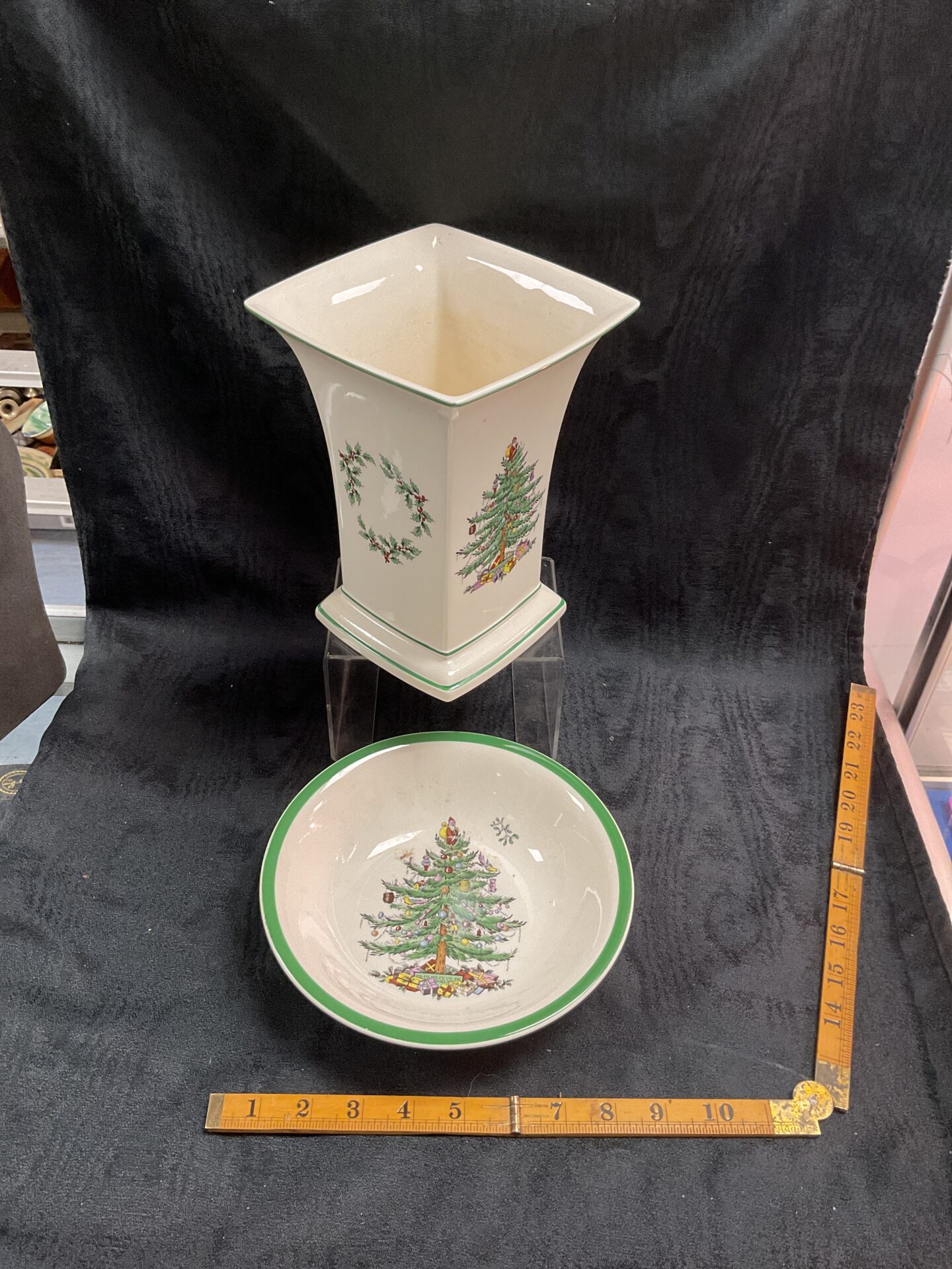 Both the vase and bowl appear to be in good condition, displaying the vibrant colours and detailed artistry characteristic of Spode. While there may be minor wear consistent with age and use, these pieces add to the vintage charm. This Spode Christmas Tree set is ideal for collectors of festive china, those seeking to enhance their holiday décor, or anyone who appreciates the timeless beauty of Spode craftsmanship.