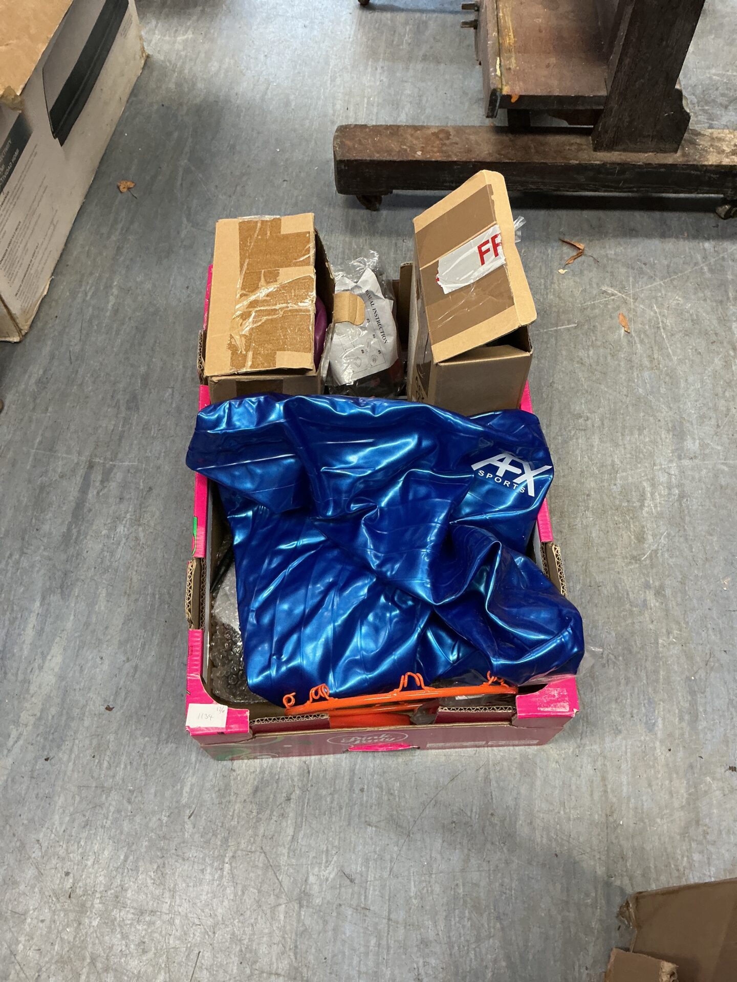This lot comprises a collection of various sports equipment, including what appears to be a basketball hoop and other athletic accessories. The blue item is likely a protective pad or cover for sports equipment, offering cushioning and safety during use. This assortment caters to a range of indoor and outdoor activities, making it ideal for enthusiasts and collectors alike.