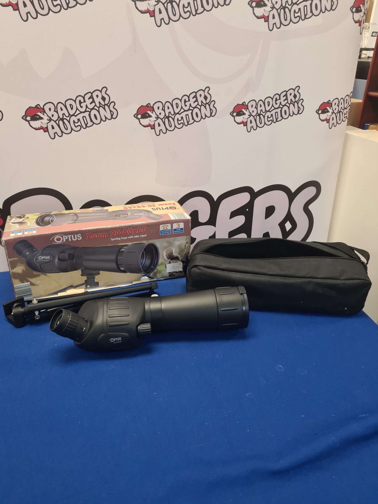 This is a boxed Optus Zoom 20-60×60 spotting scope, complete with a table tripod and carrying case. This scope offers a versatile magnification range, making it suitable for various applications such as bird watching, wildlife observation, and even basic astronomical viewing. The included tripod provides a stable base for extended observation sessions, while the case ensures safe storage and portability.