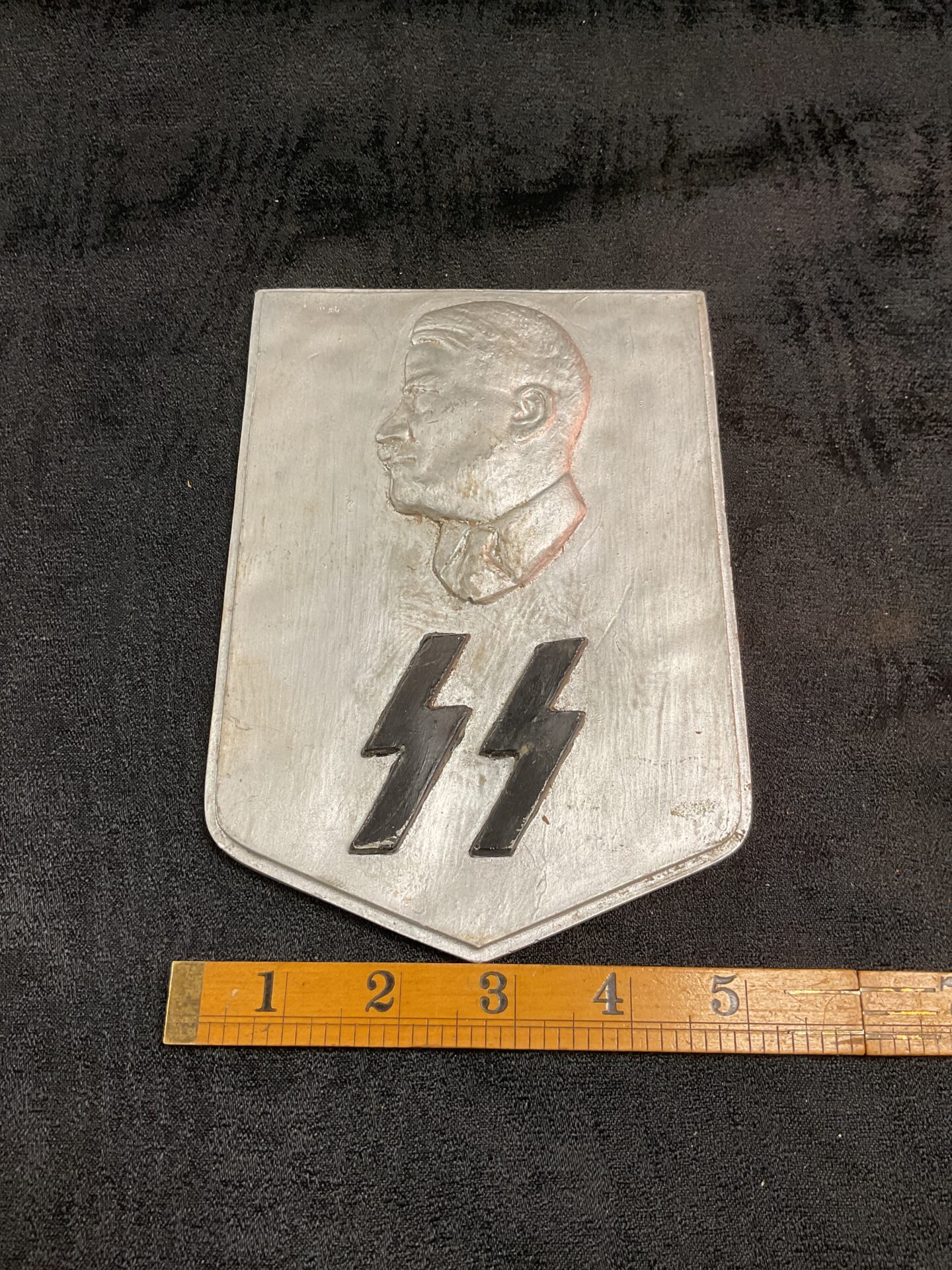 This striking ceramic shield depicts a stylized head of Adolf Hitler above the iconic SS runes. The shield is crafted from ceramic, offering a unique and durable construction. The design is bold and symbolic, representing a significant piece of historical iconography. This shield would have been a display piece, likely intended for a high-ranking SS officer or a dedicated supporter of the regime.