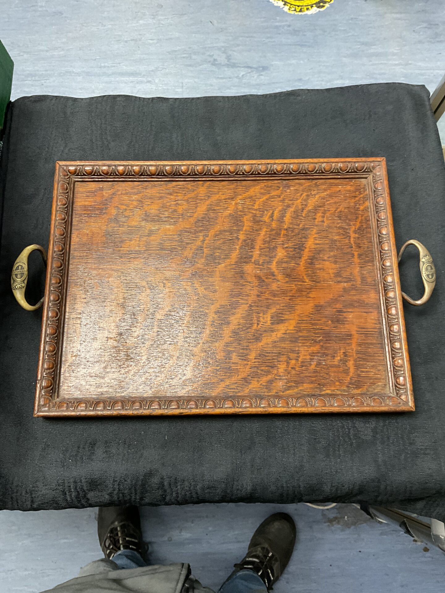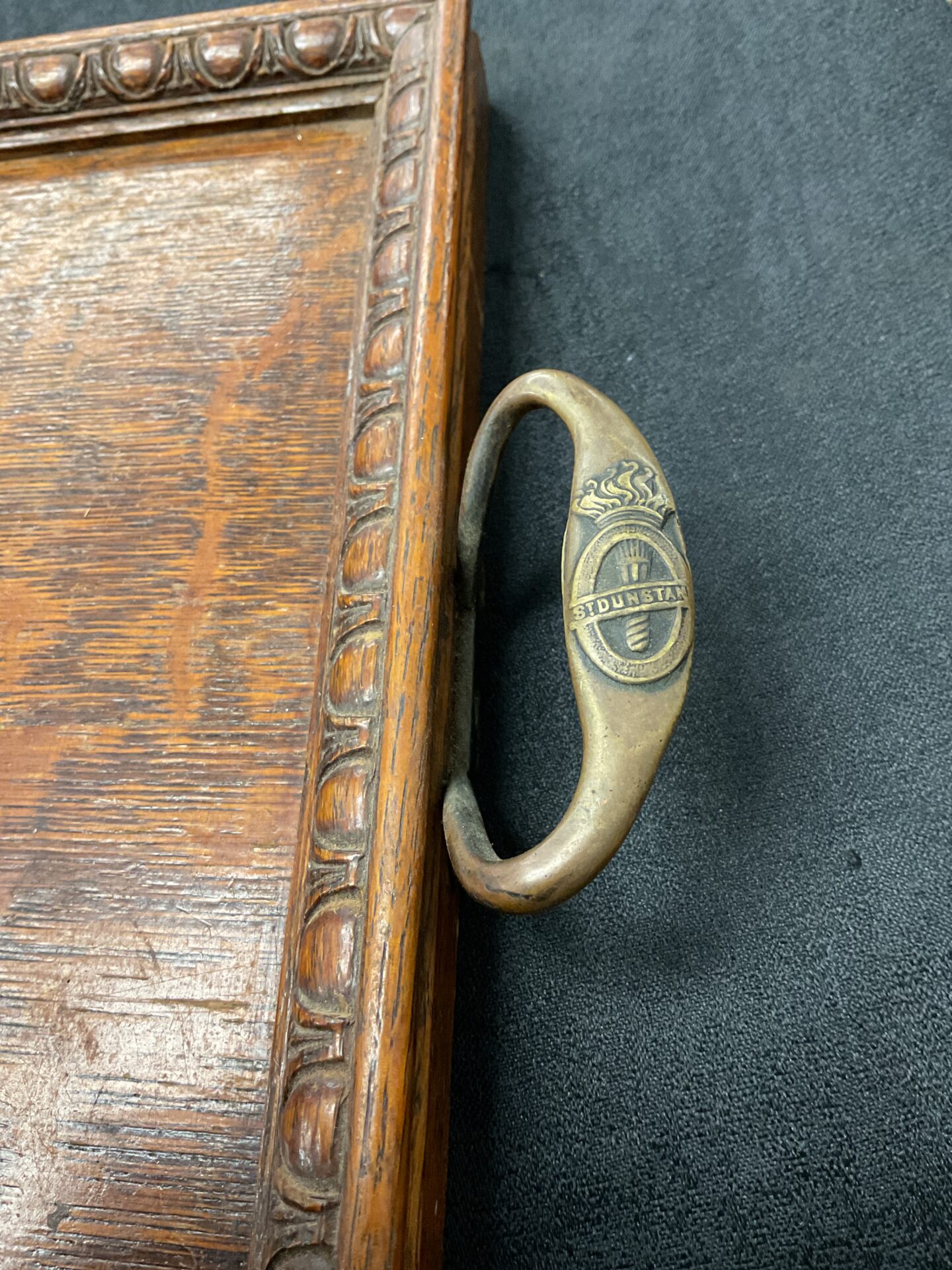 This exceptional oak serving tray was lovingly handmade by the patients and craftsmen at St Dunstan’s, the military hospital dedicated to the rehabilitation of blind and visually impaired soldiers during World War I. Established in 1915, St Dunstan’s provided vocational training, enabling veterans to regain independence and purpose. This tray exemplifies the skill and dedication of these brave men, showcasing their ability to create beautiful and functional objects despite their disabilities. The tray features a beautifully carved border and sturdy brass handles, demonstrating a high level of craftsmanship.