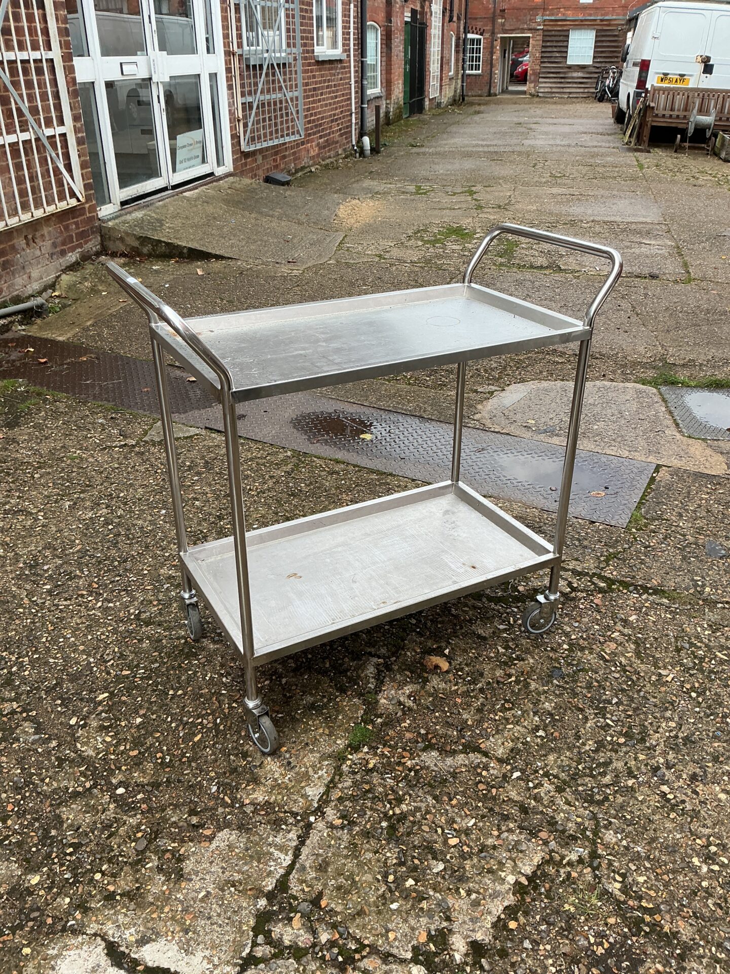This is a stainless steel service trolley, constructed with a durable metal frame and two tiers of flat surfaces. The trolley features four castors, allowing for easy movement and maneuverability. Its simple, functional design makes it suitable for a variety of uses, from serving food and drinks to transporting items in a workshop or garage.