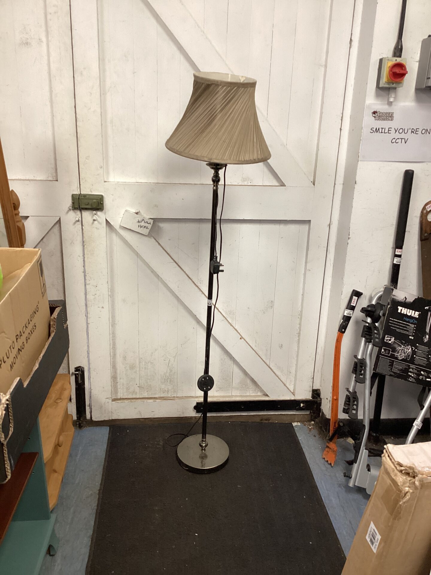 This is a classic standard lamp, featuring a sleek black stem and a cream-coloured lampshade. The lamp has an adjustable head, allowing you to direct the light where it’s needed most. Its simple yet elegant design would suit a variety of interior styles, from mid-century modern to contemporary.