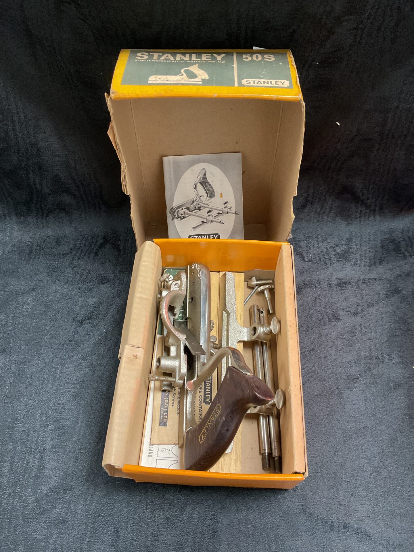 This Stanley 50s combi plane appears to be in original condition, complete with its original box. It presents well and would be of interest to collectors of vintage tools, as well as woodworkers seeking a classic, high-quality plane. The presence of the original packaging adds to its appeal and potential value.
