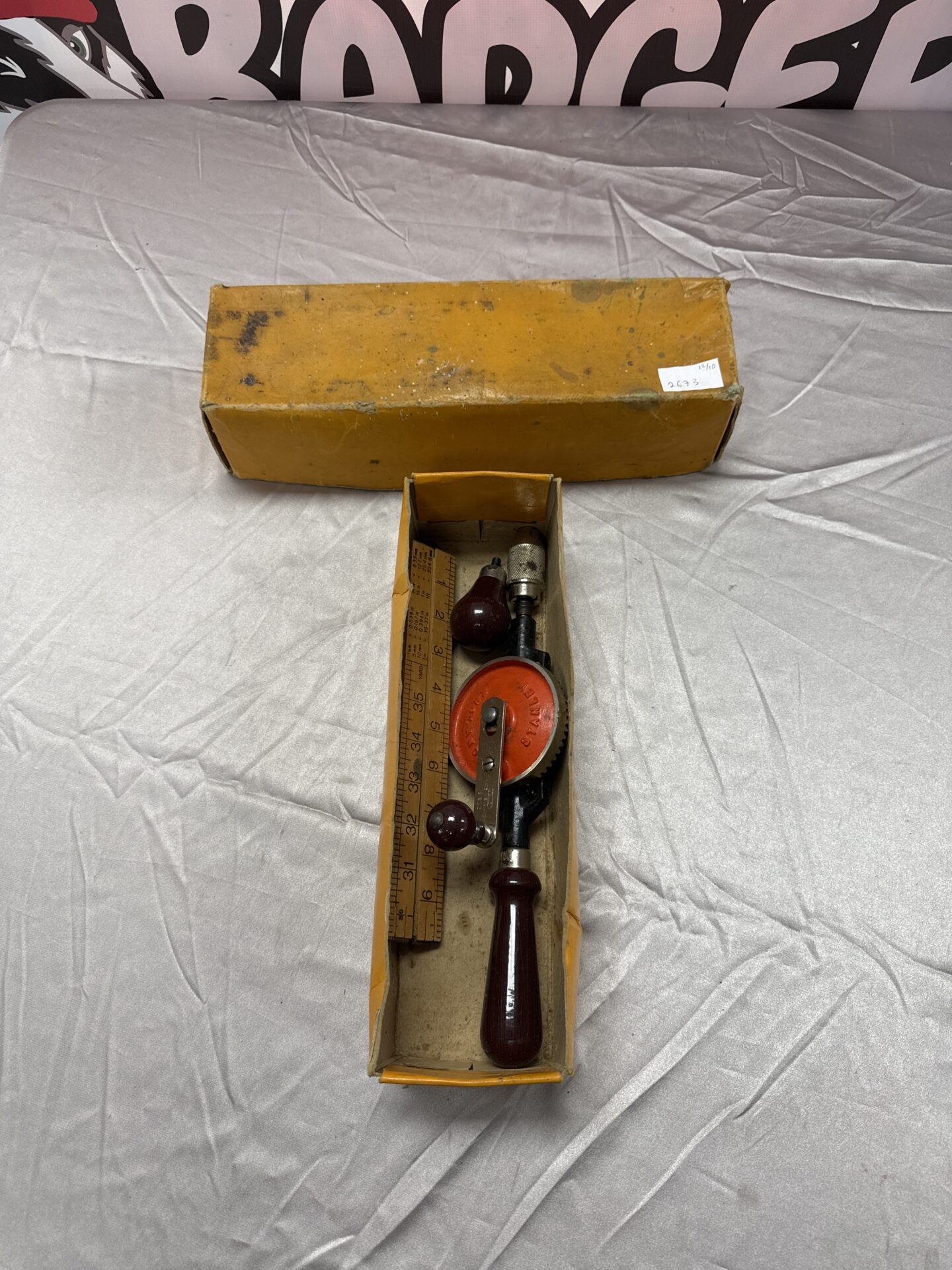 This is a classic Stanley hand drill, a robust and well-made tool from a renowned manufacturer. The drill features a wooden handle for comfortable grip and a metal chuck designed to securely hold drill bits. Included with the drill is a Rabone wooden ruler, adding to the tool’s historical charm and utility. This combination represents a practical and collectable set for woodworking enthusiasts and tool collectors alike.