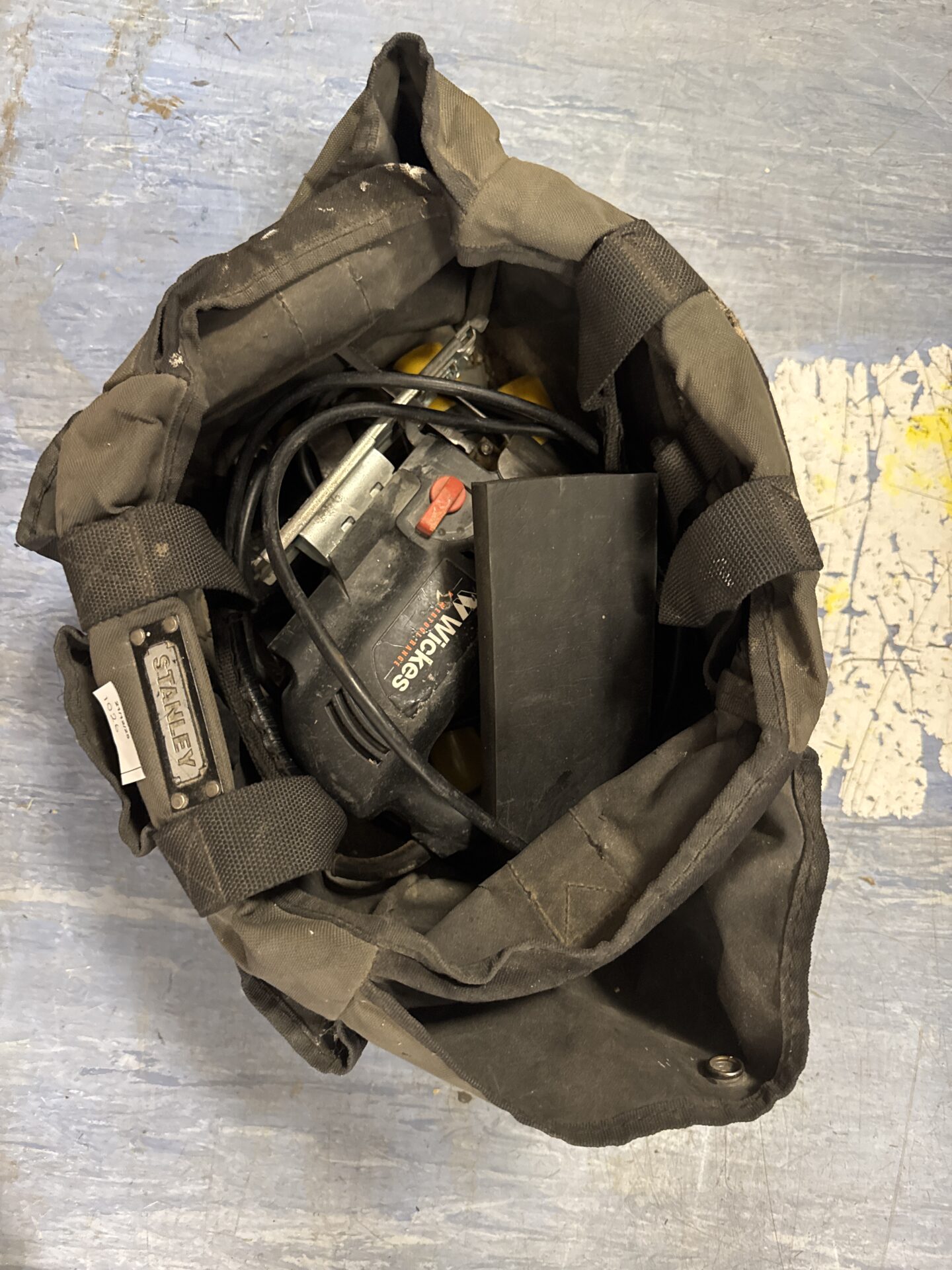 This lot comprises a Stanley toolbag containing a Wickes jigsaw and a selection of screwdrivers. The toolbag itself is constructed from a durable black fabric, designed for portability and protection of its contents. The Wickes jigsaw appears to be a standard model, intended for home DIY projects and general cutting tasks.