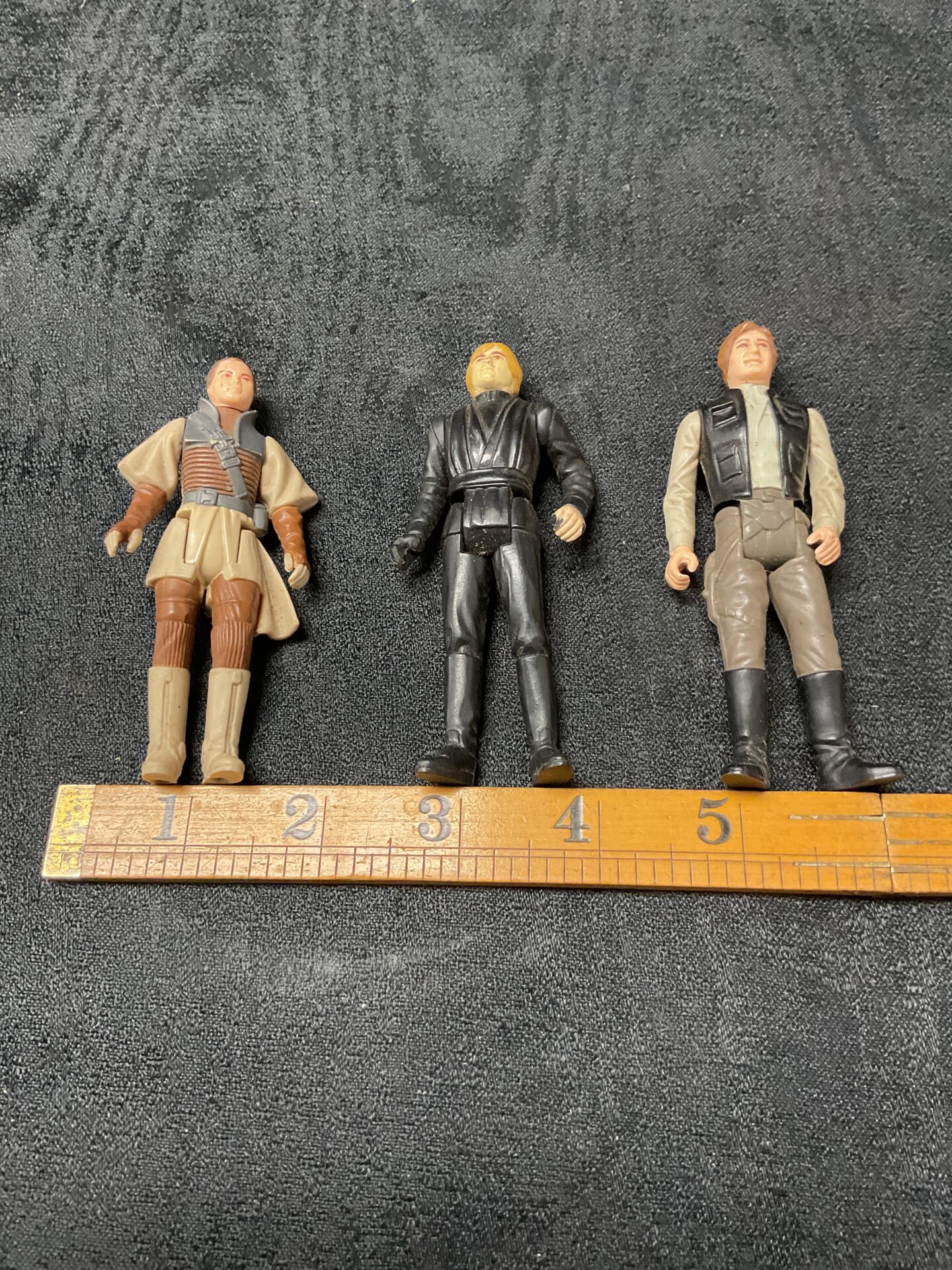 This lot features three classic Star Wars action figures: Luke Skywalker, Han Solo, and Princess Leia. These figures are from the original 1977 Kenner line, representing a cornerstone of Star Wars collecting. They showcase the iconic character designs and are instantly recognizable to fans of the original trilogy.