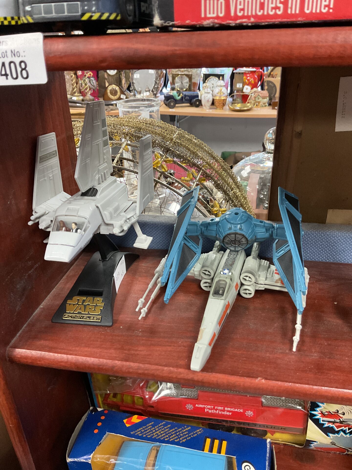 This lot features three miniature Star Wars vehicles from the popular Micro Machines line. These scaled-down spaceships capture iconic designs from the Star Wars universe, offering a delightful collectible for fans of all ages. The set includes detailed representations of classic ships, perfect for display or imaginative play.