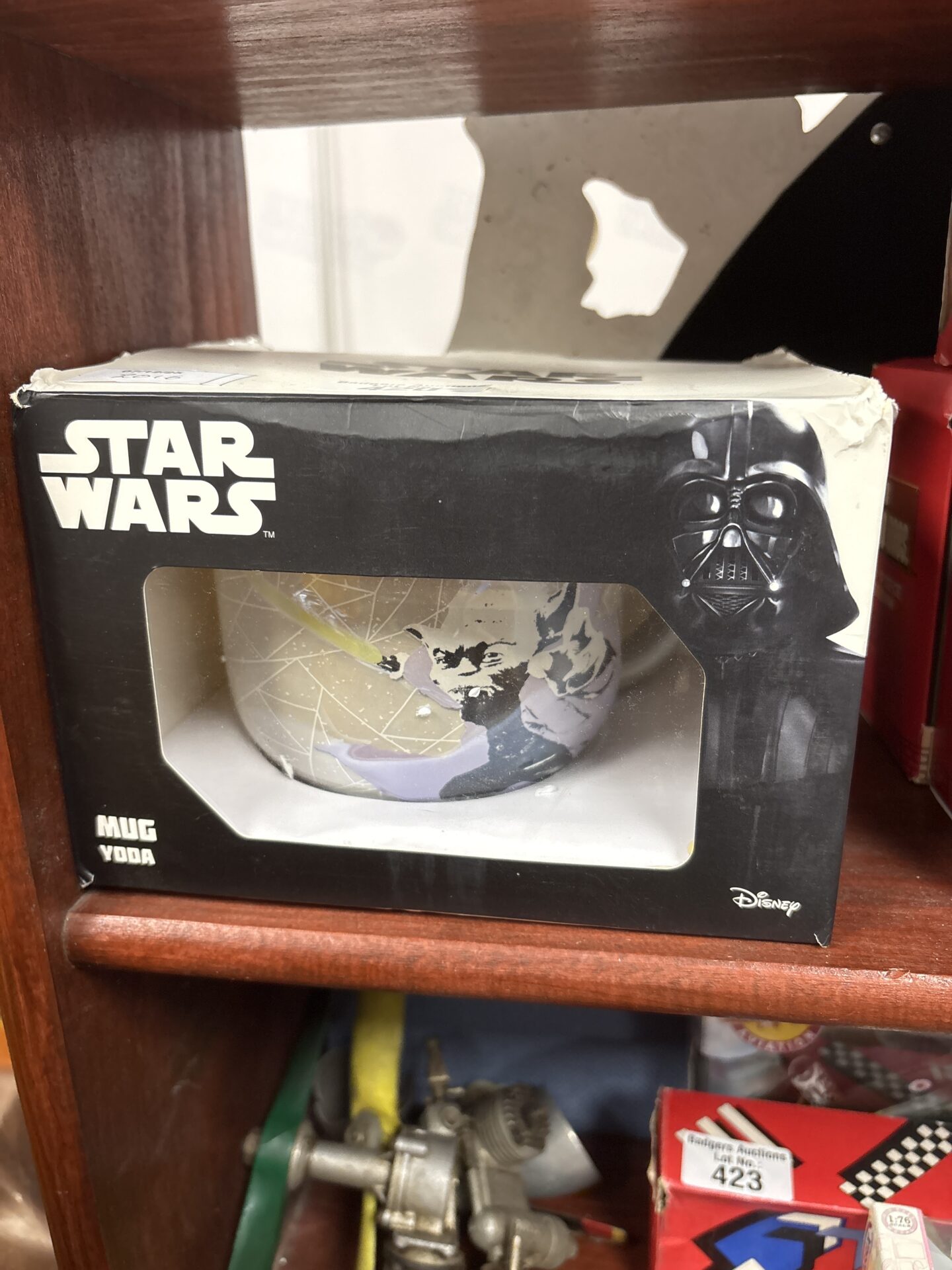 This mug appears to be in original, uncirculated condition, still within its original packaging. The box shows some wear consistent with age and storage. This item would be of interest to Star Wars collectors, mug enthusiasts, or anyone looking for a unique piece of memorabilia.