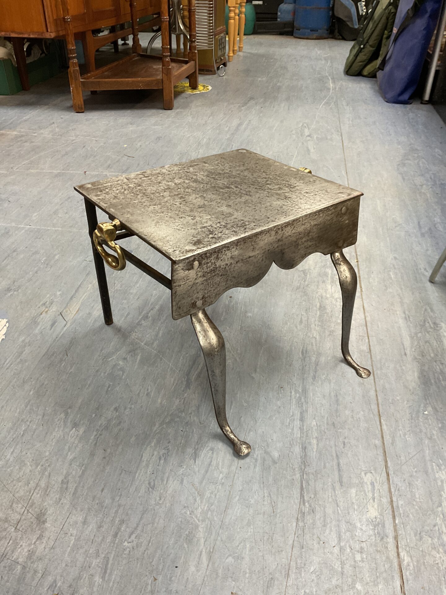 This is a large antique steel range trivet, likely dating from the Georgian or Victorian period. Constructed from heavy gauge steel, it features elegantly shaped legs and robust construction, designed to withstand the heat of a traditional range cooker. The trivet is fitted with brass handles, adding a touch of refinement to its utilitarian design. It would have been used to keep dishes warm or to finish cooking slowly on the cooling surface of a range.