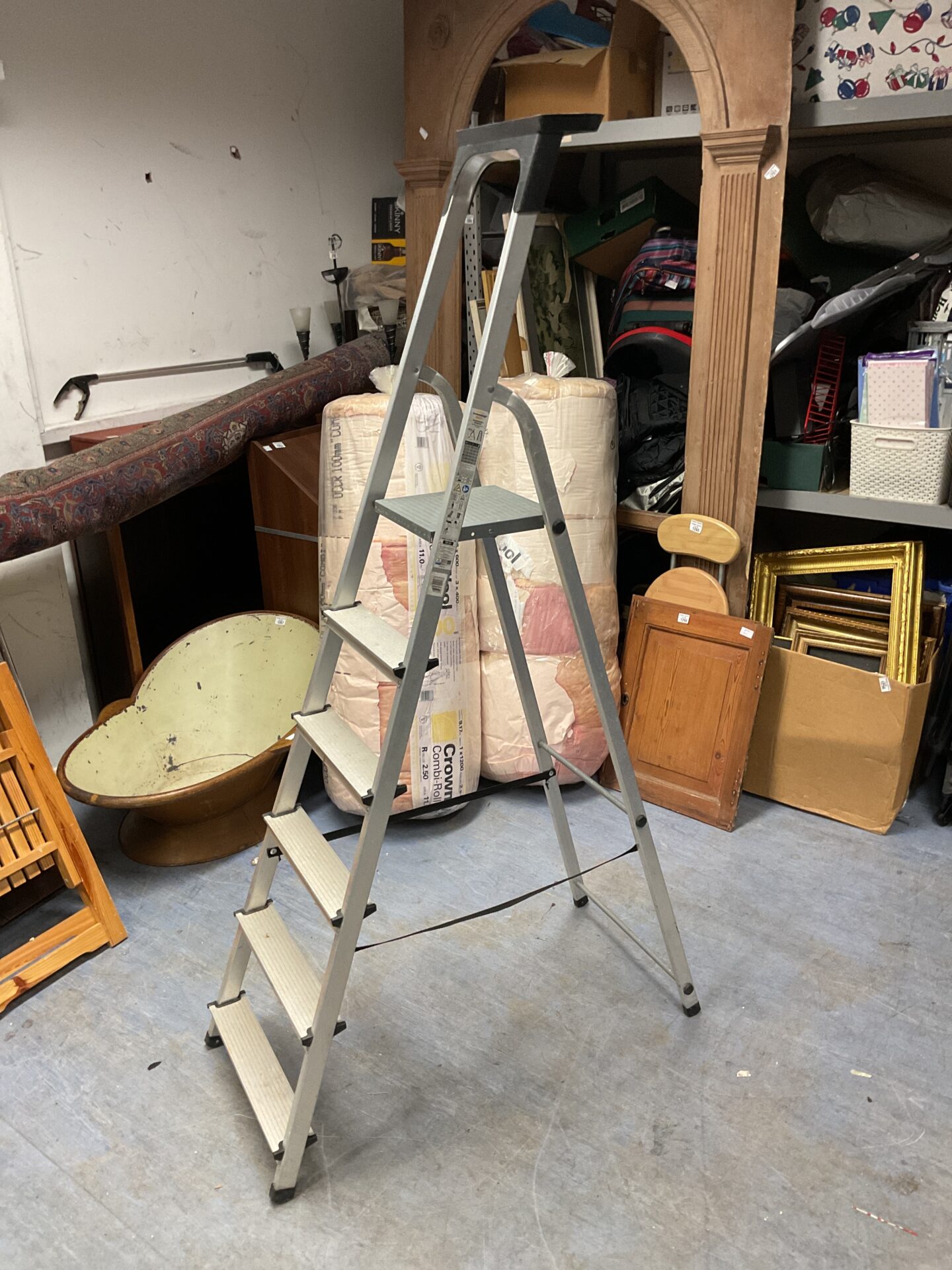 This 5ft aluminum step ladder is a practical tool for reaching higher areas around the home. Its folding design allows for easy storage and transport. Offered in used condition, this ladder is ideal for DIY enthusiasts or those needing a simple solution for household tasks.