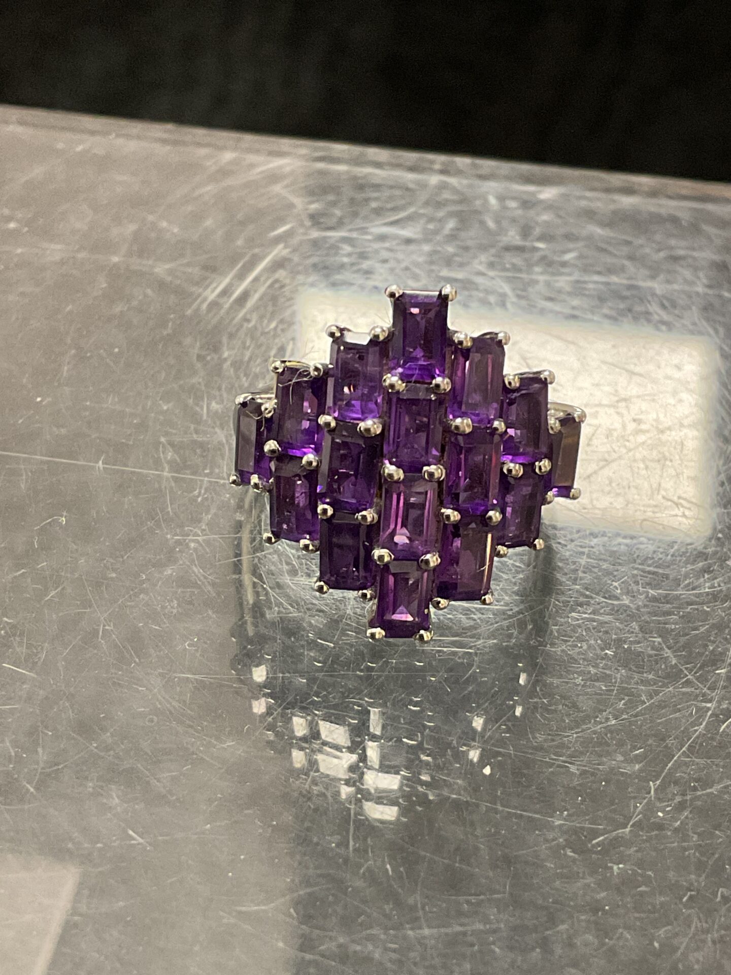 This ring features a cluster of square-cut amethyst gemstones set in sterling silver. The design showcases a vibrant purple hue from the amethyst stones, creating a striking and eye-catching piece of jewellery. Weighing 4.8g and sized P, this ring offers a comfortable fit and a classic aesthetic.