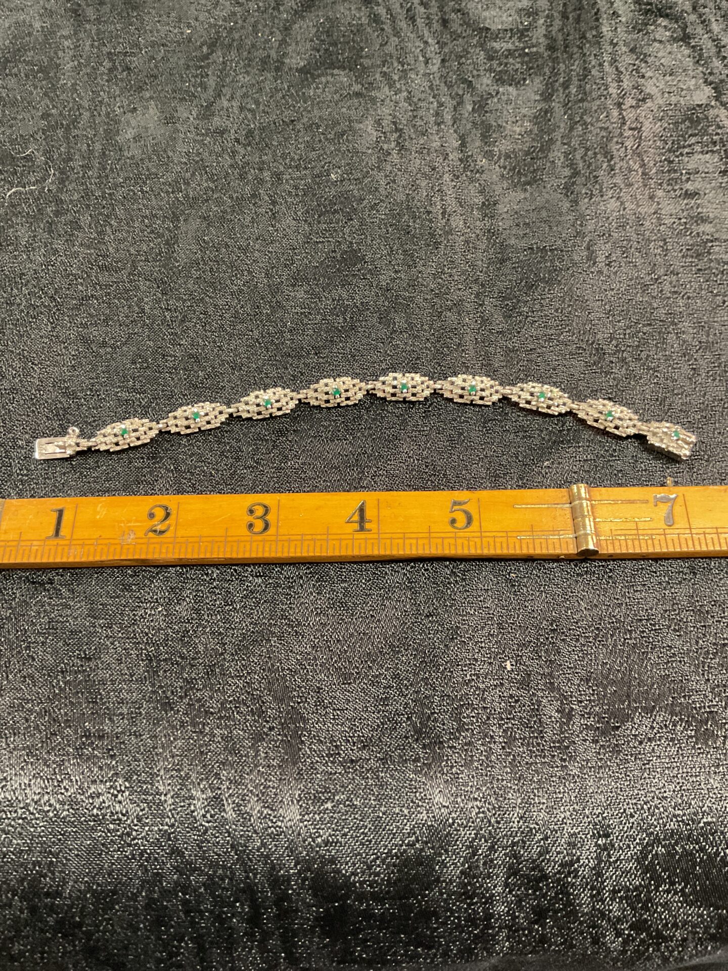 The bracelet appears to be in good vintage condition, with minimal signs of wear consistent with its age. It would be a desirable piece for collectors of vintage silver jewellery or those who appreciate Art Deco design. The bright green stones and classic styling make this bracelet a timeless piece that can be enjoyed for years to come.