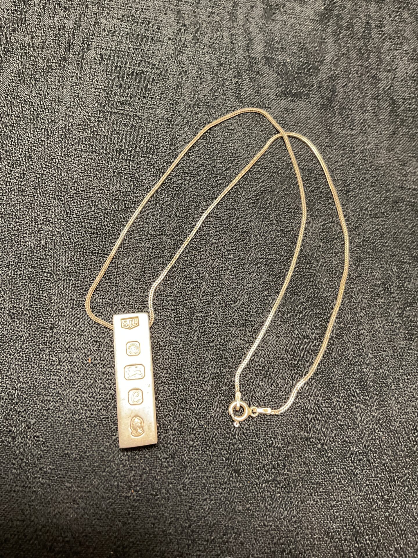 This pendant and necklace are presented in good condition, ready for wear or display. Hallmarked silver pieces are always desirable to collectors, and this ingot pendant offers a classic design. The weight of the set is 23.4g, adding to its substantial feel and quality.