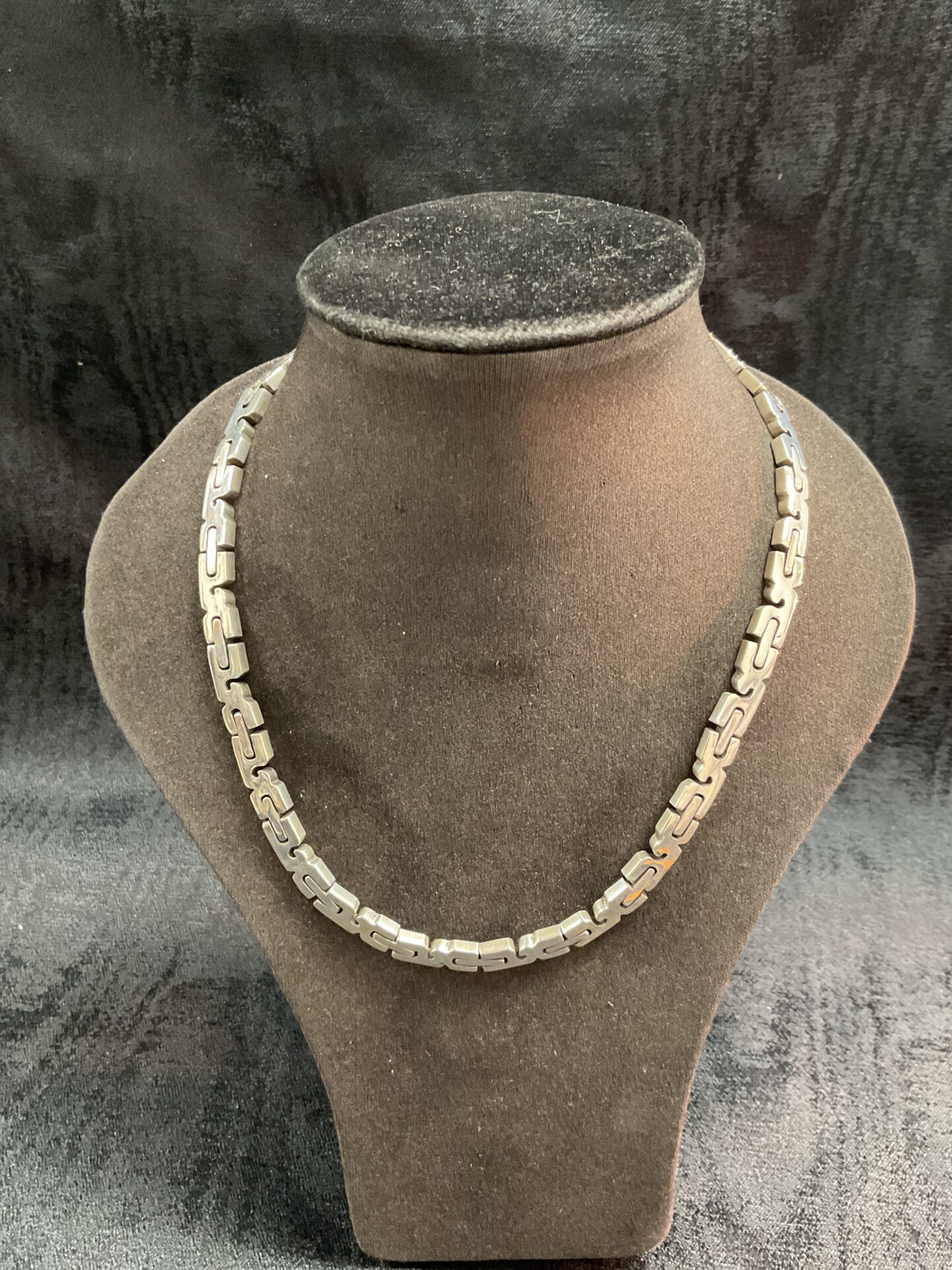 This substantial necklace is crafted from solid sterling silver, featuring a bold, heavy link design. The links are meticulously constructed, creating a visually striking piece. Hallmarked for authenticity, this necklace offers a classic and timeless aesthetic, suitable for both everyday wear and special occasions. Weighing 83.4g, it has a substantial feel and presence.