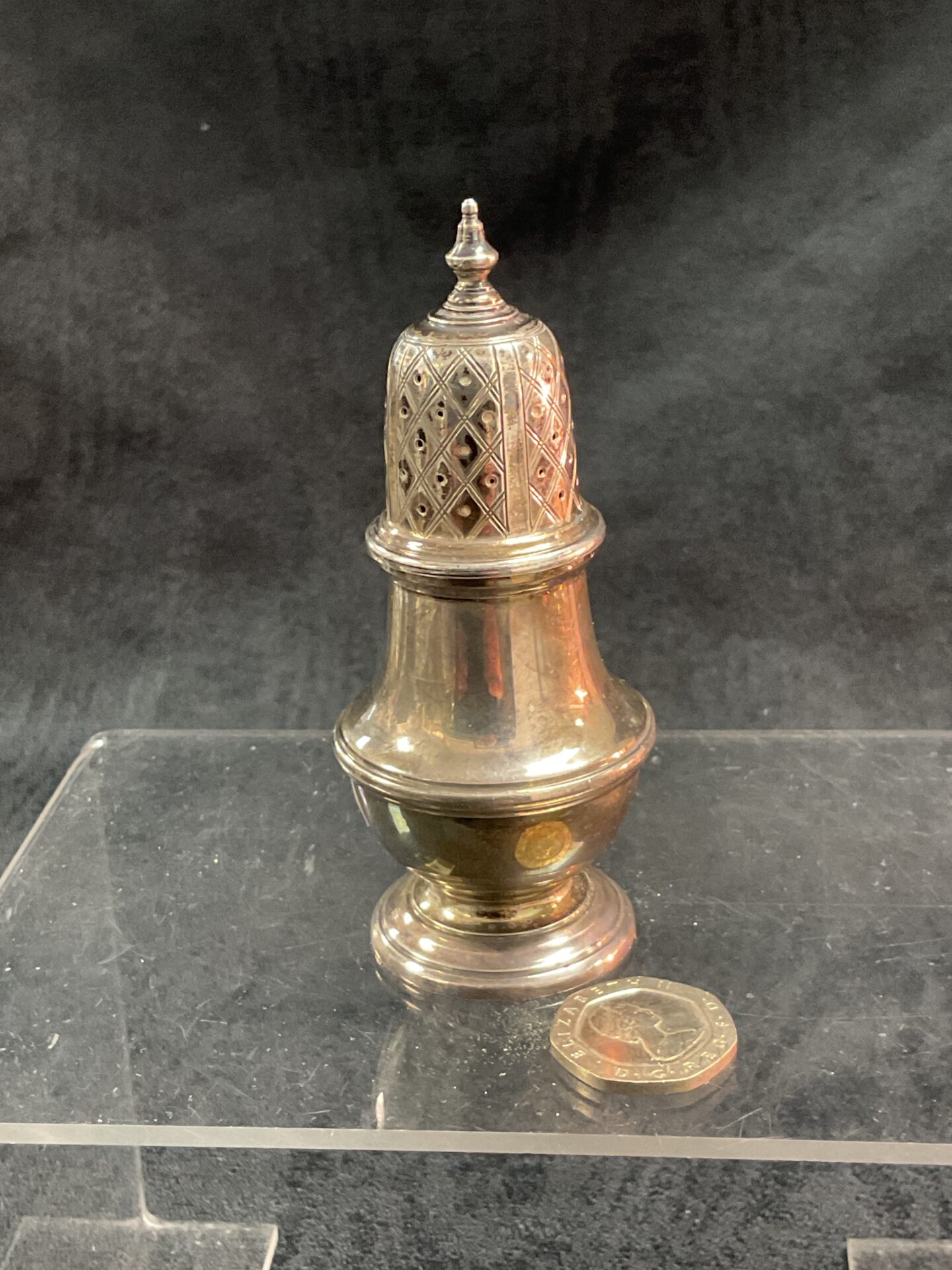 This pepper sifter presents in good condition, commensurate with age and use. While there may be minor surface wear or patina consistent with its age, it remains a visually appealing and functional piece. Its hallmarked status and classic design make it desirable for collectors of antique silver, or those seeking a unique and elegant addition to their dining set.