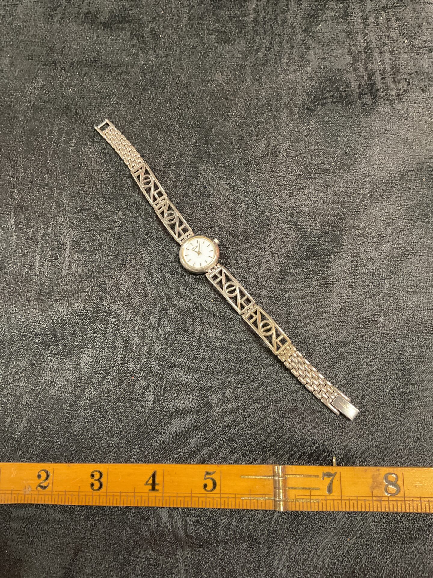 This elegant wristwatch by Rotary features a striking Art Deco-inspired design. The watch boasts a sterling silver bracelet and case, weighing 31.5g, and a classic dial with hour markers. This timepiece offers a blend of vintage charm and timeless style, making it a sophisticated accessory for any occasion.