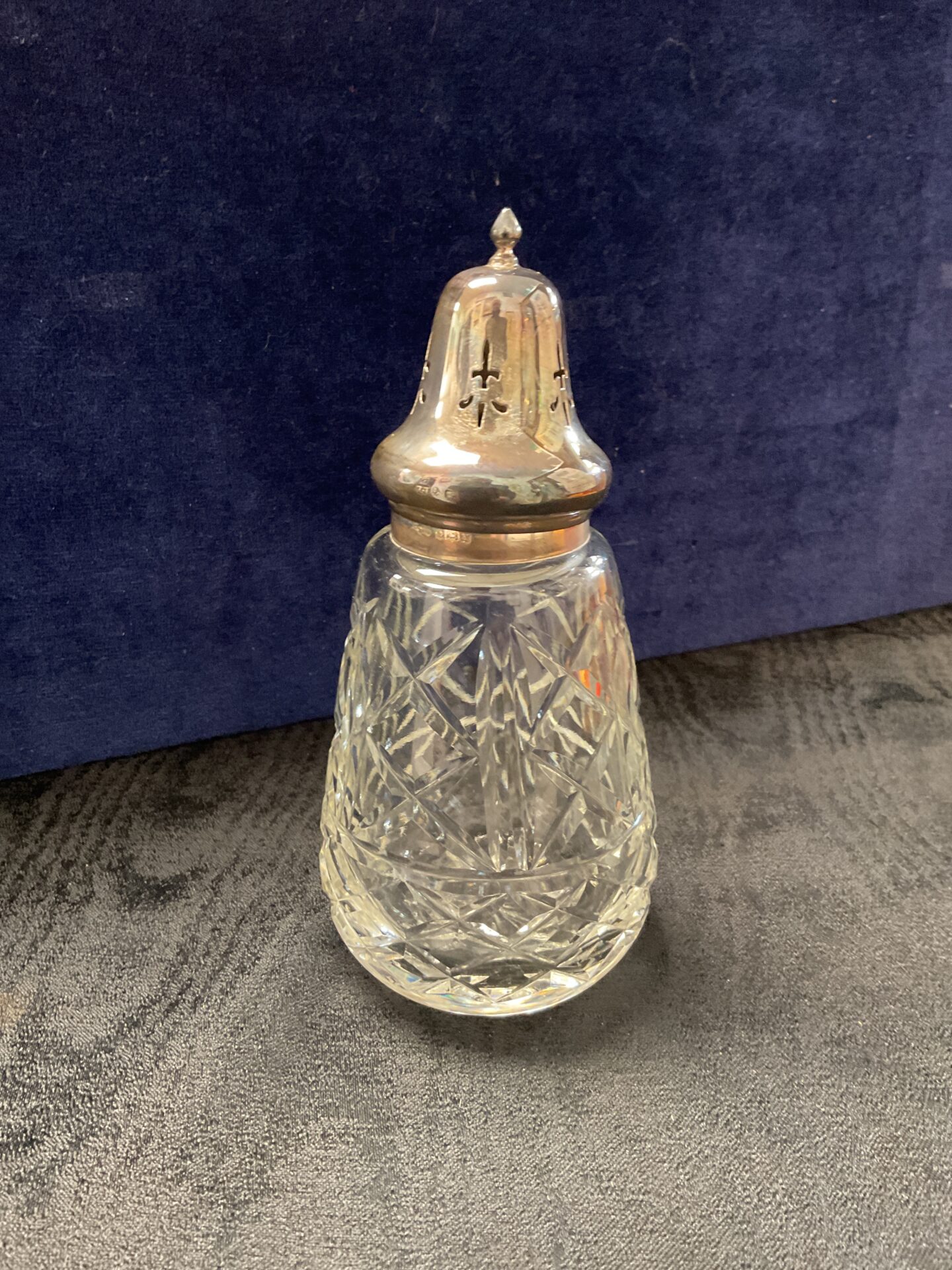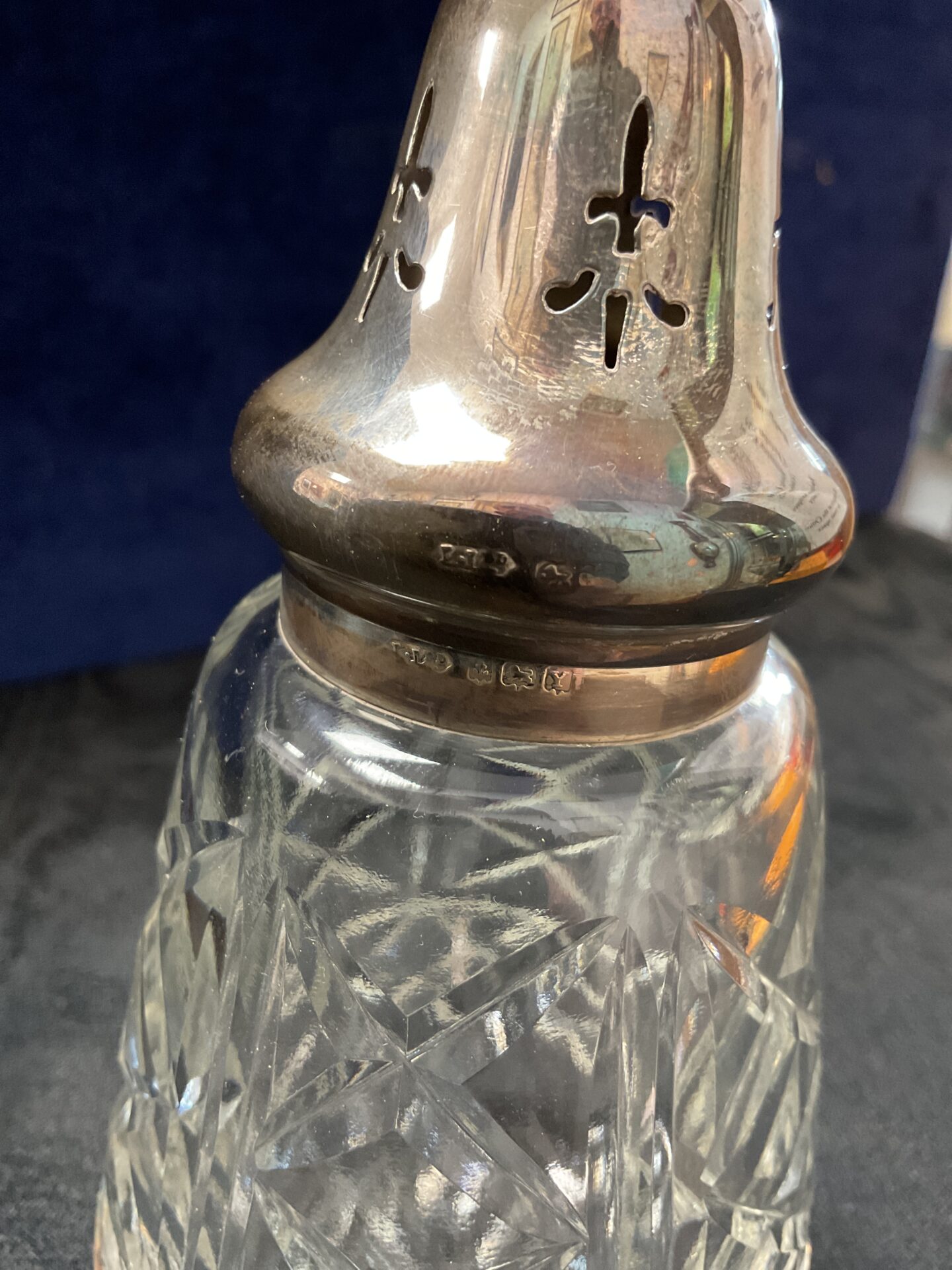 The sifter is in good condition, displaying the expected patina consistent with age and use. The glass is free from chips or cracks, and the silver top is securely attached. This piece is a desirable addition to a collection of antique silver or vintage kitchenalia, offering both aesthetic appeal and a glimpse into the dining habits of the mid-20th century.