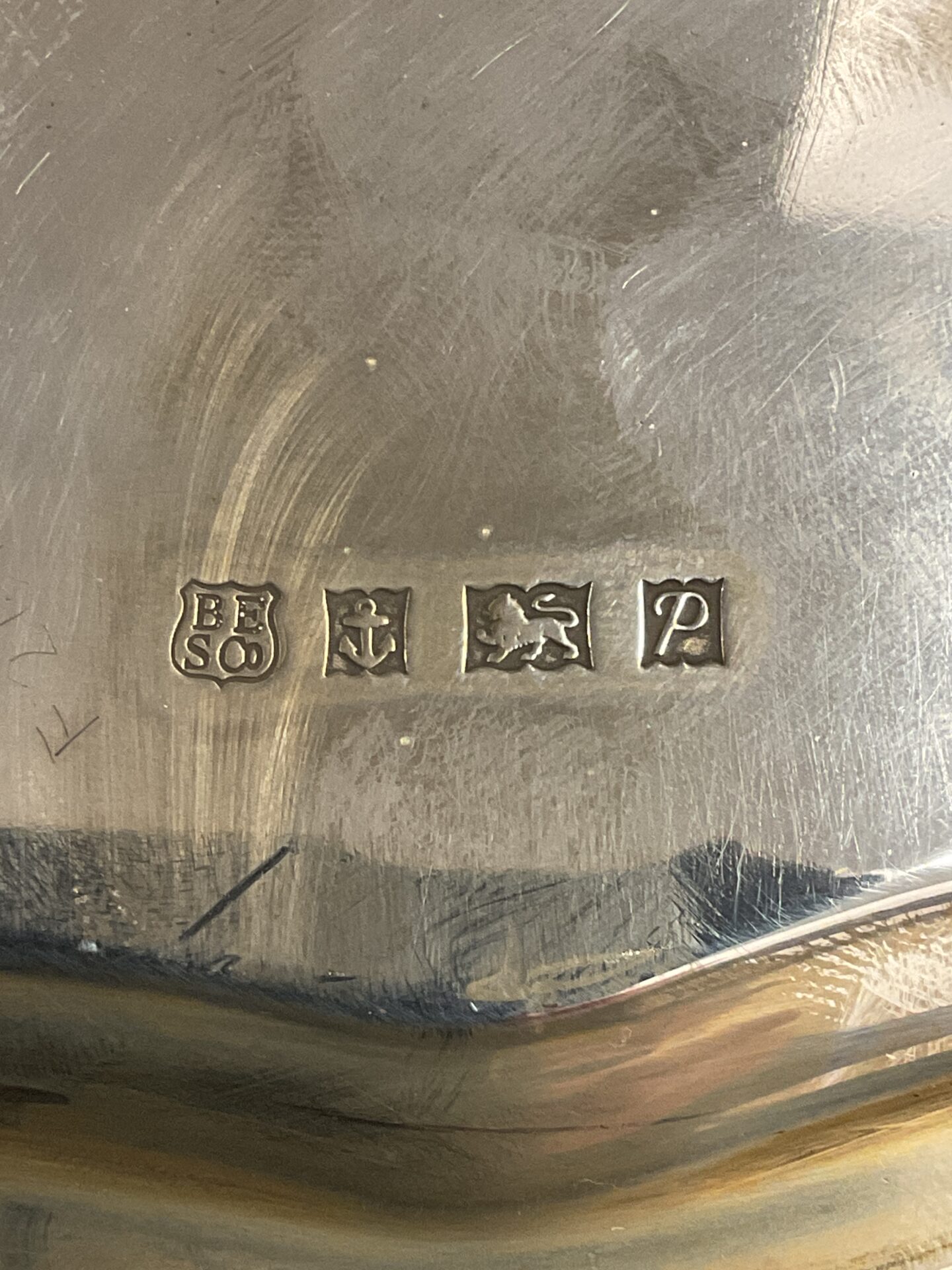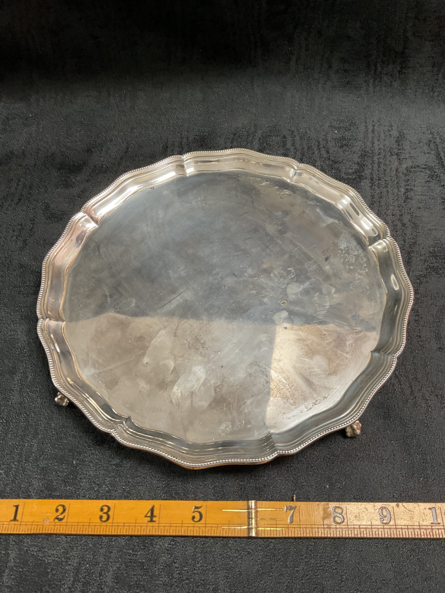 This is a beautifully crafted sterling silver tray, featuring elegant ball and claw feet and a decorative, scalloped rim. The tray is hallmarked, indicating its sterling silver composition and origin. The design is classic and timeless, suitable for serving or display, and its substantial weight of 646g speaks to the quality of the silver used in its construction.