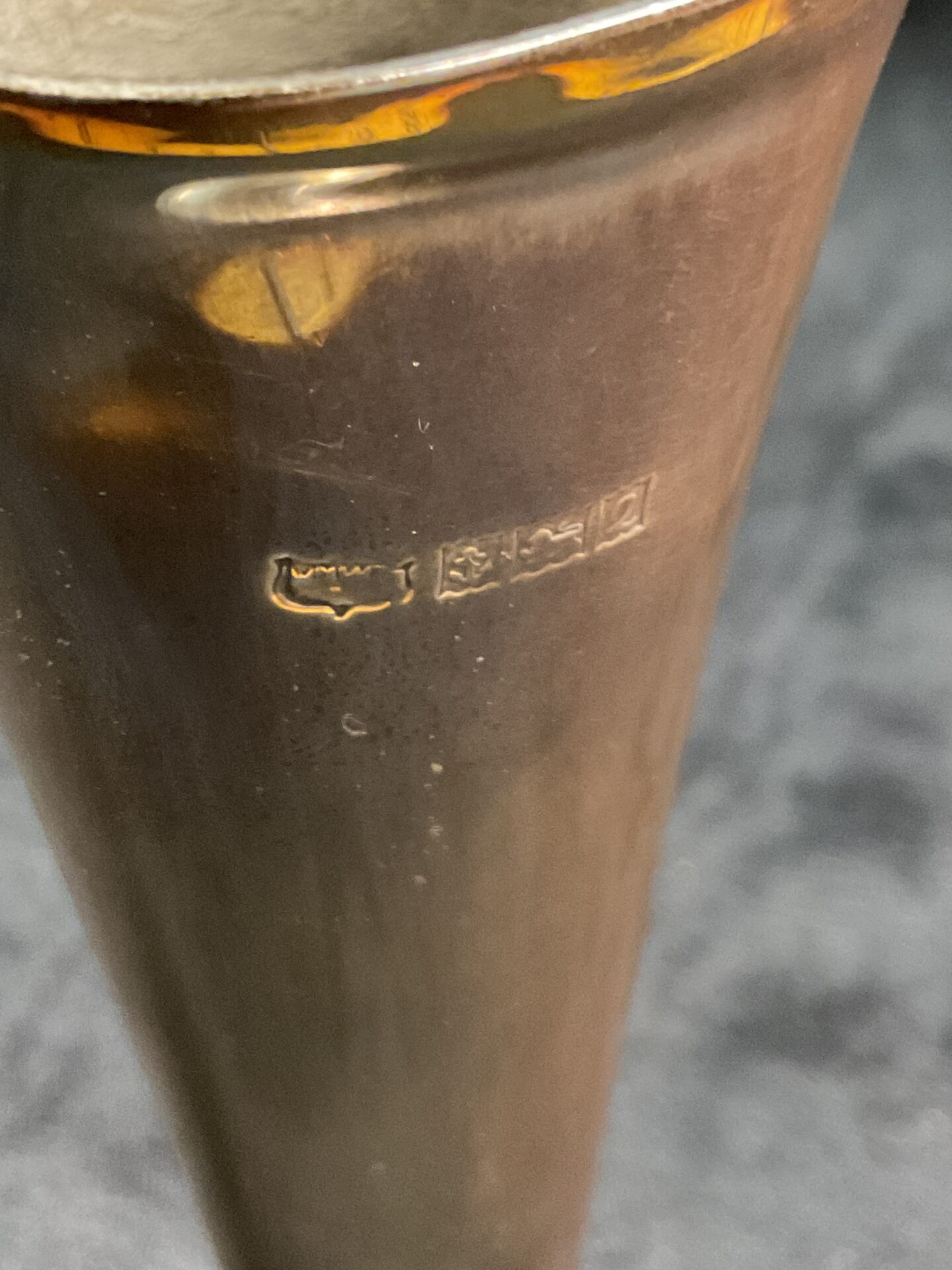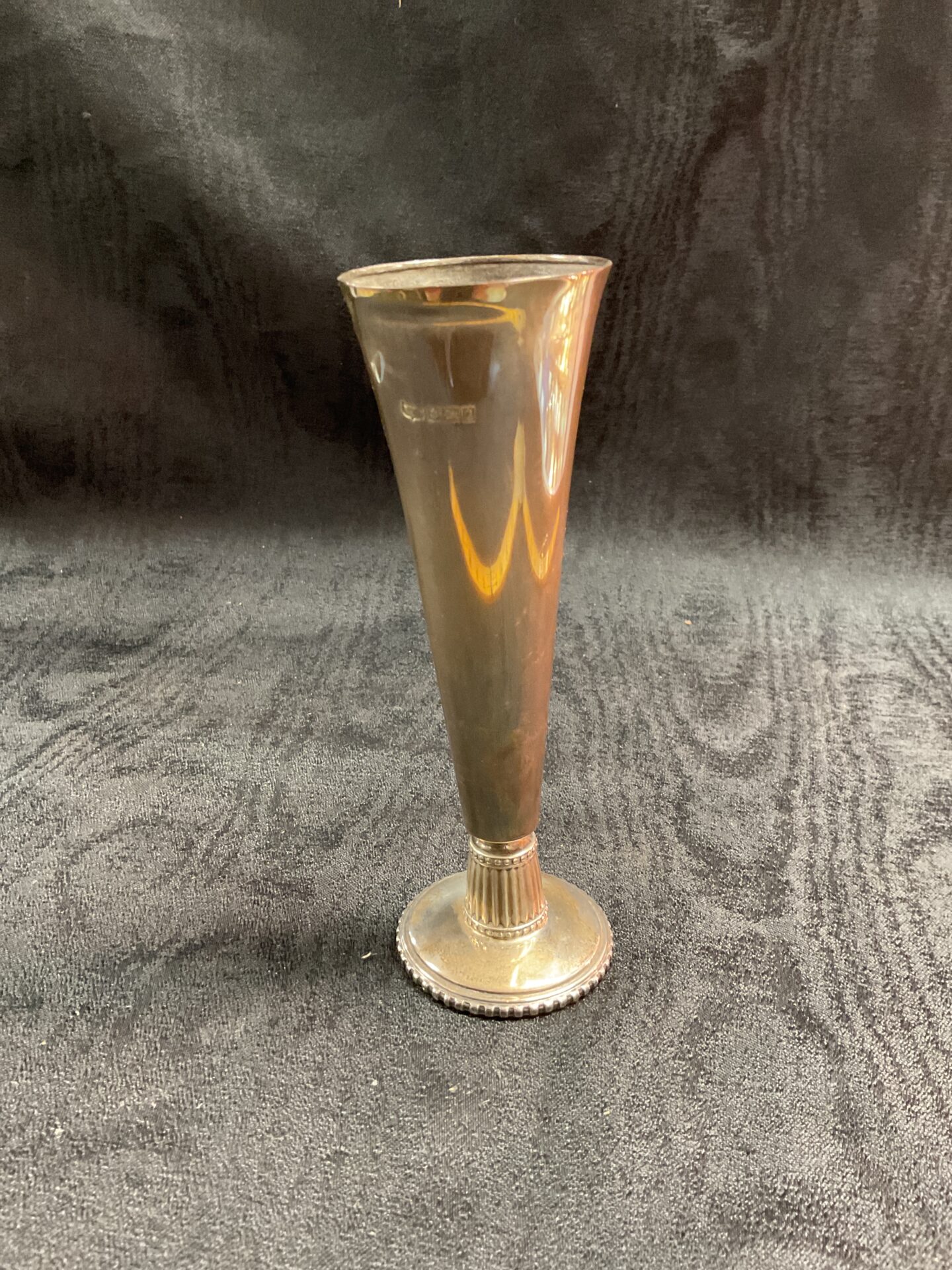This elegant trumpet vase is crafted from hallmarked sterling silver, featuring a beautifully flared form. The vase has a weighted base, providing stability, and is adorned with a subtly textured design around the base and stem. The hallmarking indicates the silver content and origin, adding to its authenticity and appeal.