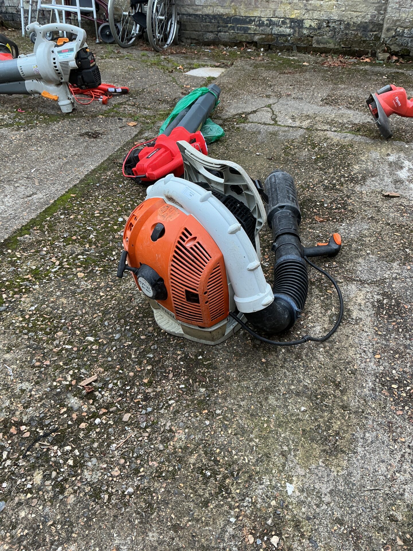 This Stihl backpack leaf blower is presented for auction in used condition. Please examine the images carefully to assess its condition. It may be of interest to gardeners, landscapers, or collectors of vintage garden tools.
