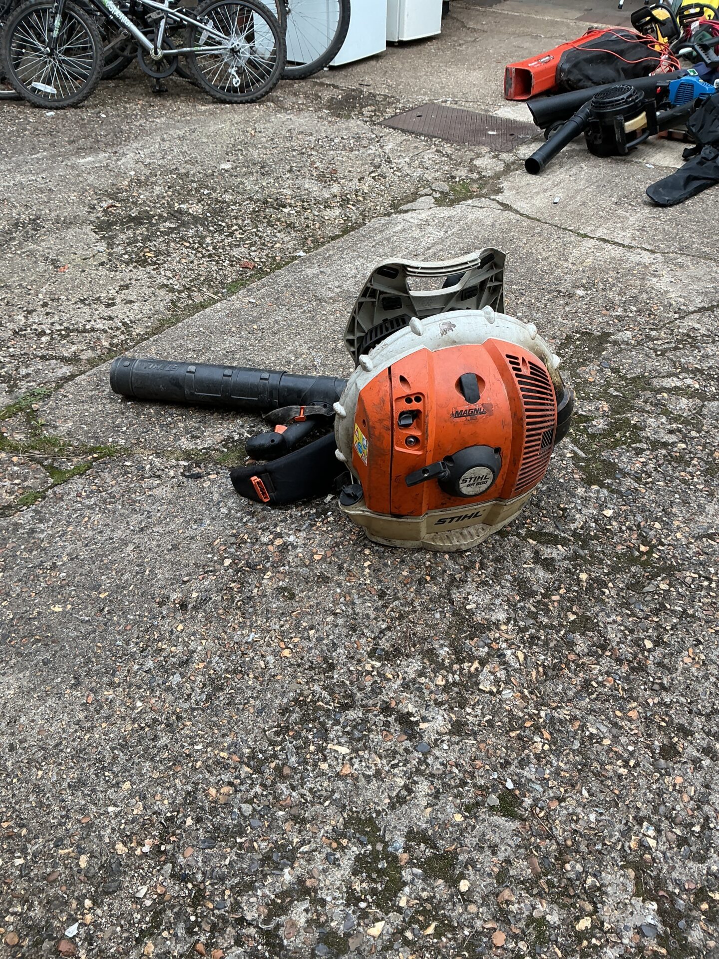 This is a Stihl BR 600 Magnum petrol leaf blower, a powerful and reliable tool for clearing leaves and debris from gardens, driveways, and other outdoor spaces. The BR 600 is known for its high blowing force and efficient performance, making it a favourite among professional landscapers and homeowners alike. It features a robust construction and a comfortable design for extended use.
