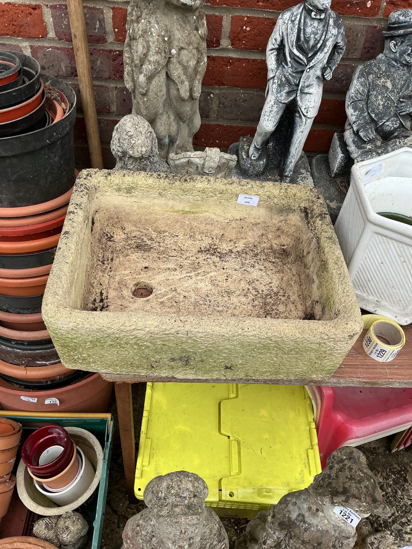 This substantial stone basin is a classic addition to any garden setting. Crafted from a durable stone material, it presents a rustic, weathered aesthetic, ideal for creating a natural focal point. Its generous size makes it suitable for a variety of uses, from a traditional water feature to a unique planter for larger plants, or simply as a decorative garden ornament.