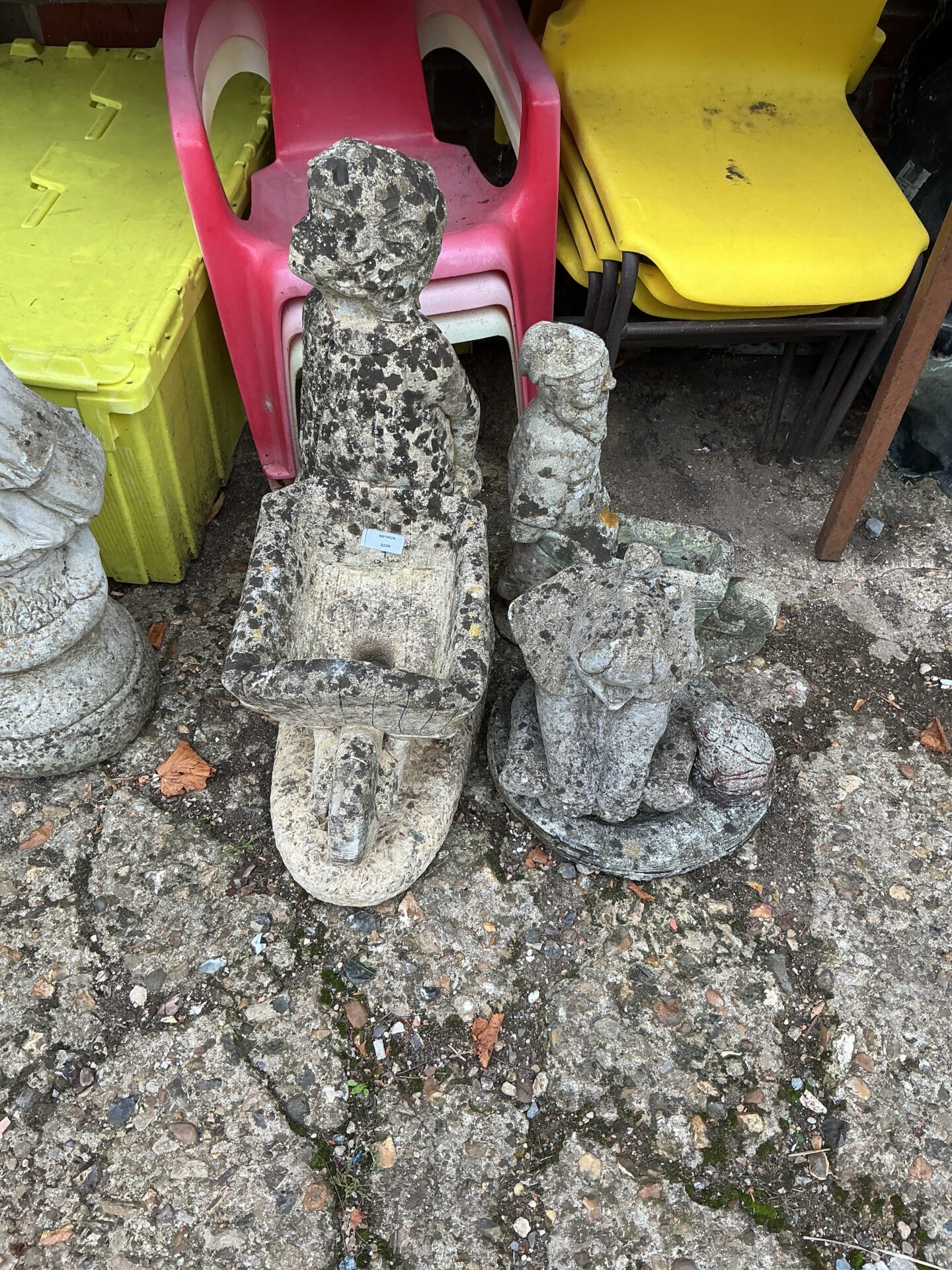 This ornament shows signs of weathering consistent with outdoor display, adding to its rustic charm. It appears to be a solid, well-made piece, and while not pristine, it retains its structural integrity and visual appeal. Collectors of garden statuary or those seeking unique outdoor decor will appreciate its character and enduring quality.